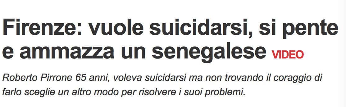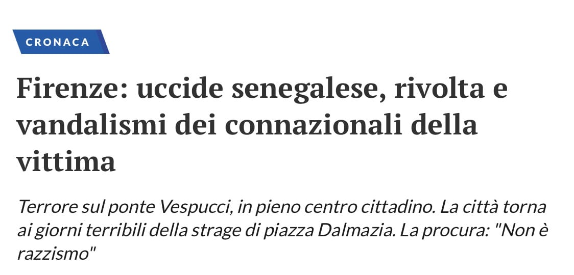 Idy Diene, senegalese 54enne, è stato ucciso a colpi di pistola a Firenze da un 65enne italiano che secondo la stampa “era uscito per suicidarsi.” Poi ha preferito ammazzare qualcun altro, “il primo che mi è passato davanti” — che casualmente, siamo certi, era una persona di colore. (Il Fatto Quotidiano)