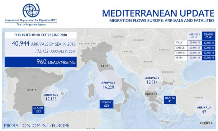 L’IOM fa il punto della situazione sulle migrazioni via mare di quest’anno, esattamente dimezzate rispetto a quelle del 2017 (40944 migranti contro 84675). Ma il numero che più di tutti dimostra la crudeltà del governo italiano è un altro: è 960, il numero di persone che sono state lasciate morire nel Mediterraneo. (ReliefWeb)