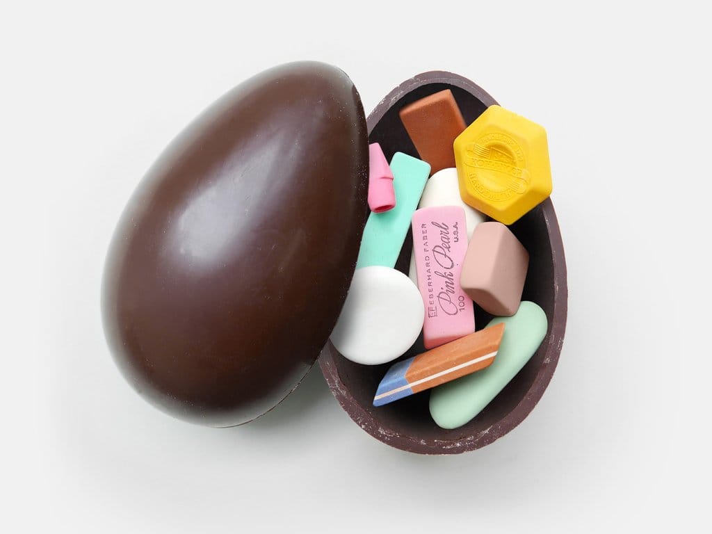 Questo uovo di cioccolata è pieno della sorpresa migliore di tutte: 16 gomme da cancellare. Peccato costi 35 sterline. (Present & Correct)