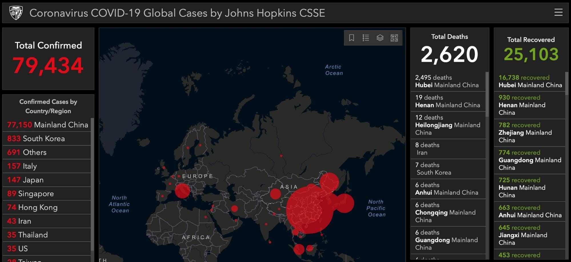 L’Italia, in questo momento, è il terzo Paese per numero di contagi nel mondo dopo la Cina e la Corea del Sud. Se volete seguire la diffusione del virus su scala mondiale, i ricercatori del CSSE dell’Università Johns Hopkins Ensheng Dong, Hongru Du e Lauren Gardner hanno realizzato una mappa aggiornata in tempo reale e basata sui dati dell’OMS che mostra il numero di nuovi contagi, il numero di persone guarite e il numero di decessi, Paese per Paese. È consultabile a questo link da mobile e qui da desktop. La mappa è accompagnata da un articolo sul Lancet e il codice è disponibile su GitHub.
