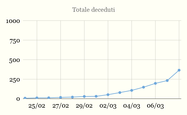L’ultimo bollettino, reso noto alle 18 di domenica 8 marzo dalla protezione civile, parla di 7375 contagi totali da nuovo coronavirus in Italia. Il numero di deceduti è salito a 366, mentre 622 persone risultano guarite dal Covid-19..