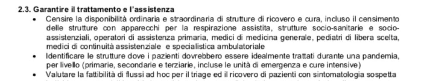 Il piano sottolinea l’importanza di conoscere in anticipo le risorse a disposizione per affrontare un’eventuale pandemia, raccomandando di “definire i criteri per la sospensione di ricoveri programmati e la resa in disponibilità di posti letto aggiuntivi” e “individuare le misure di supporto non di tipo sanitario, quali l’incremento dei permessi per assistenza ex-L.104/92, i servizi di assistenza domiciliare (conferimento pasti /spesa), il riconoscimento di permessi lavorativi a volontari.”