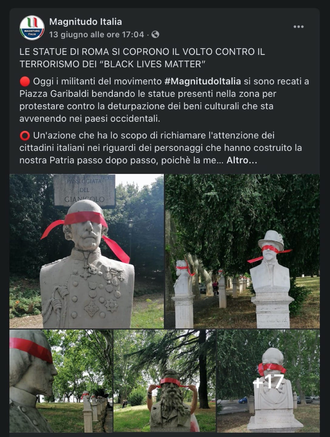 Alla denuncia Magnitudo Italia ha risposto parlando di “fake news della sinistra universitaria,” ammettendo però implicitamente di accettare l’inquadramento come organizzazione di estrema destra. Scorrendo la loro pagina Facebook si trovano altri segnali d’allarme, come una fotogallery di busti con gli “occhi” coperti con una banda rossa “contro il terrorismo dei ‘Black Lives Matter’.”