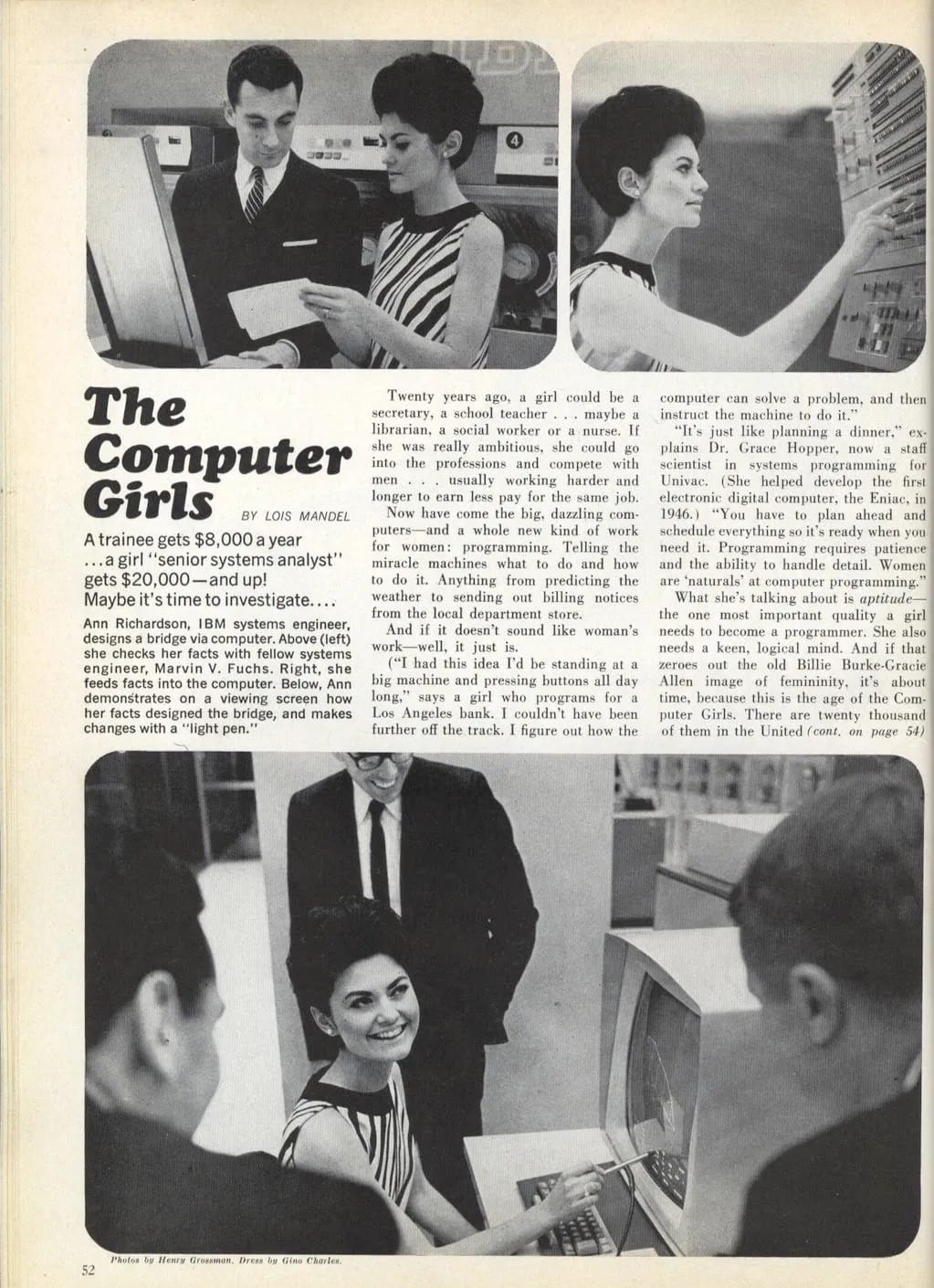 Sulla rivista femminile Cosmopolitan nel numero di aprile 1967 viene pubblicato un breve articolo, intitolato “Computer Girls.” Il pezzo, scritto da Lois Mandel, parla di un tempo in cui il le opportunità di carriera per le donne nel settore della programmazione erano diffuse e comuni, visto che si trattava di un ambiente prevalentemente femminile.