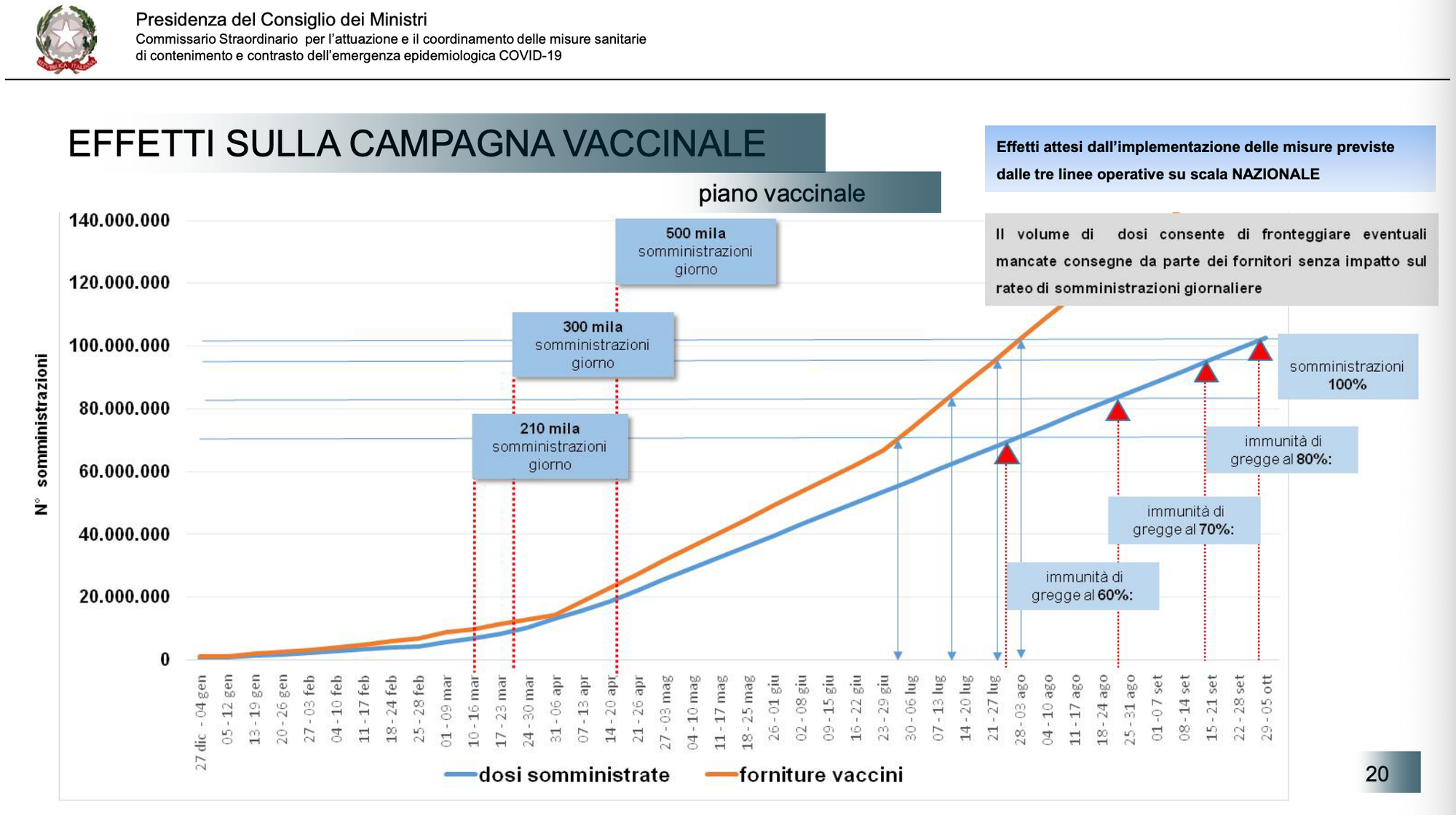 Stamattina i giornali danno conto di “telefonate” che Mario Draghi starebbe vacendo ai vertici delle case farmaceutiche, in accordo con la Commissione europea, per fare pressione sulle consegne e scongiurare nuovi ritardi. Non risulta, però, che il presidente del Consiglio o il commissario straordinario Figliuolo si siano assunti la responsabilità di aver elaborato un piano con obiettivi irraggiungibili e già smentiti dalla realtà dei fatti. Pochi giorni fa, intervistato dal Corriere della Sera, Figliuolo ha detto che aprile è il mese “decisivo,” ribadendo che entro la fine si arriverà al traguardo delle 500 mila vaccinazioni giornaliere — “se il sistema regge.” Anche Draghi, parlando con i governatori regionali a fine marzo, aveva detto che l’obiettivo delle 500 mila dosi “non sembra così lontano.”