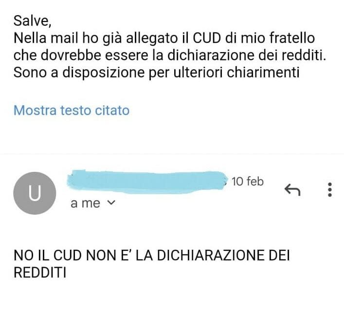 Pensando precisamente a questa evenienza, noi avevamo specificato che il fratello di Bujar sarebbe stato disposto a fare da garante per l’intero importo della stanza doppia (440 euro). Abbiamo quindi riaffermato la disponibilità e idoneità del fratello di Bujar per fare da garante a entrambi. L’agente immobiliare si è esasperata: “Avrebbe dovuto mandare solo i documenti di suo fratello e non quelli esteri se sapeva che la Proprietà non li avrebbe accettati. Così mi fa perdere tempo e crea solo confusione. Comunque sarà la proprietà a decidere se suo fratello è abbastanza capiente per tutti e due. A tale proposito chiedo anche la dichiarazione dei redditi di suo fratello […]”. Bujar: “Salve, nella mail ho già allegato il CUD di mio fratello, che dovrebbe essere la dichiarazione dei redditi. Sono a disposizione per ulteriori chiarimenti.” Qui l’agente immobiliare ha perso la calma, scrivendo una mail tutta in caps lock e senza punteggiatura per sottolineare la nostra stupidità: “NO IL CUD NON È LA DICHIARAZIONE DEI REDDITI.”