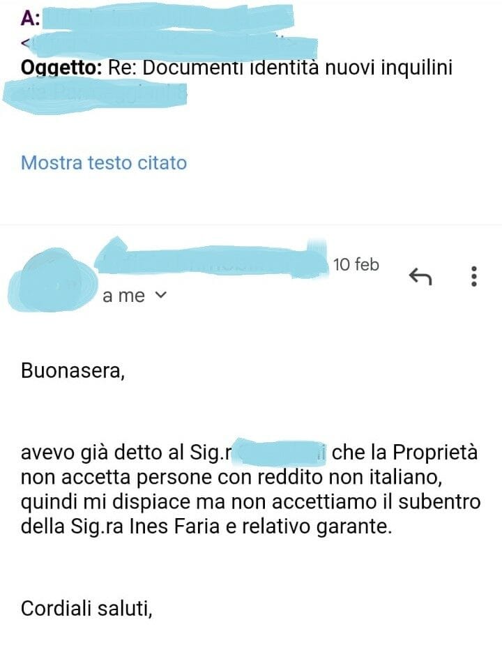 Un po’ più tardi, nello stesso giorno, l’agente immobiliare ha cercato di liquidare la nostra proposta, sempre via mail: “Buonasera, avevo già detto al sig. Rossi [uno dei coinquilini uscenti] che la Proprietà non accetta persone con reddito non italiano, quindi mi spiace ma non accettiamo il subentro della Sig.ra Ines Faria e relativo garante.”
