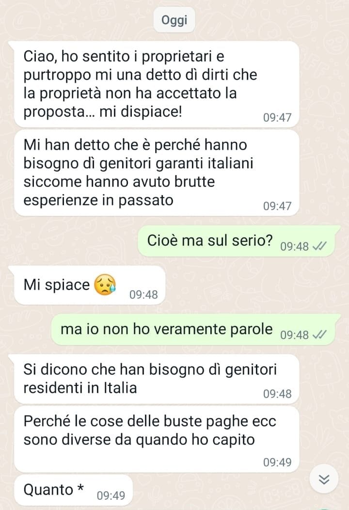 “Ciao, ho sentito i proprietari e purtroppo mi hanno detto di dirti che la proprietà non ha accettato la proposta… mi dispiace! Mi hanno detto che è perché hanno bisogno di genitori garanti italiani siccome hanno avuto brutte esperienze in passato.”