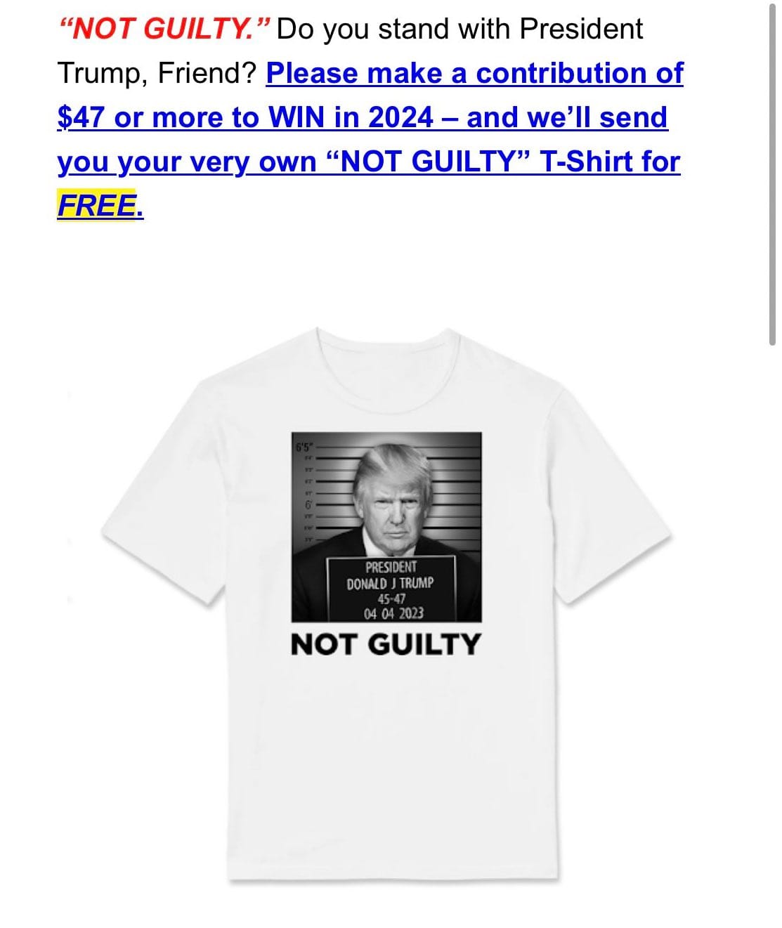 Alla fine Trump non è stato ammanettato, e non ci sono stati momenti particolarmente iconici: è trasparente che Trump conta di giocare la carta della persecuzione politica nella prossima campagna elettorale, e il suo comitato elettorale ieri ha messo in vendita una nuova maglietta con una falsa foto segnaletica dell’ex presidente. L’organizzazione invierà le magliette “gratis” a tutte le persone che donano almeno 47 dollari per la prossima campagna elettorale. Un retroscena di Rolling Stone rivela che il il comitato elettorale sperava di ricavare dalla giornata utile materiale per la campagna elettorale. Alla fine, il comitato elettorale si sarebbe comunque dovuto accontentare di una foto segnaletica falsa, perché nello stato di New York le foto segnaletiche non sono più pubbliche — la pubblicazione sarebbe comunque ritardata finché il procuratore distrettuale Bragg non invierà i materiali del caso ai legali d Trump, e a quel punto l’ex presidente potrebbe rendere la foto pubblica.