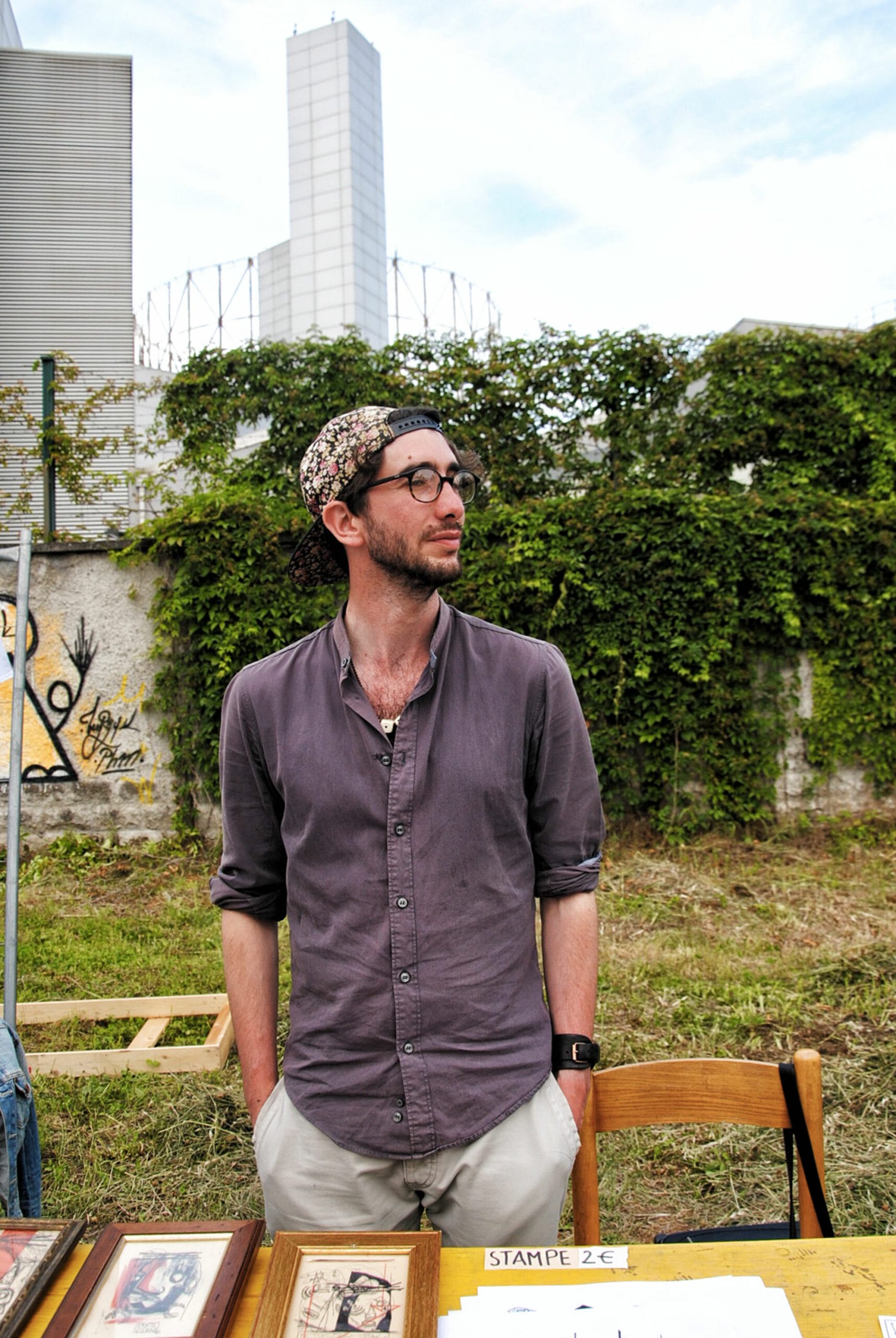 Il primo con cui parliamo è Sante Visioni, 29 anni, di Firenze. Al secolo Sandro (“una mia amica mi chiamava Santo, prima mi facevo chiamare Le Visioni, e così è nato il nome d’arte”) ha iniziato a dipingere come membro di un gruppo elettro–punk.