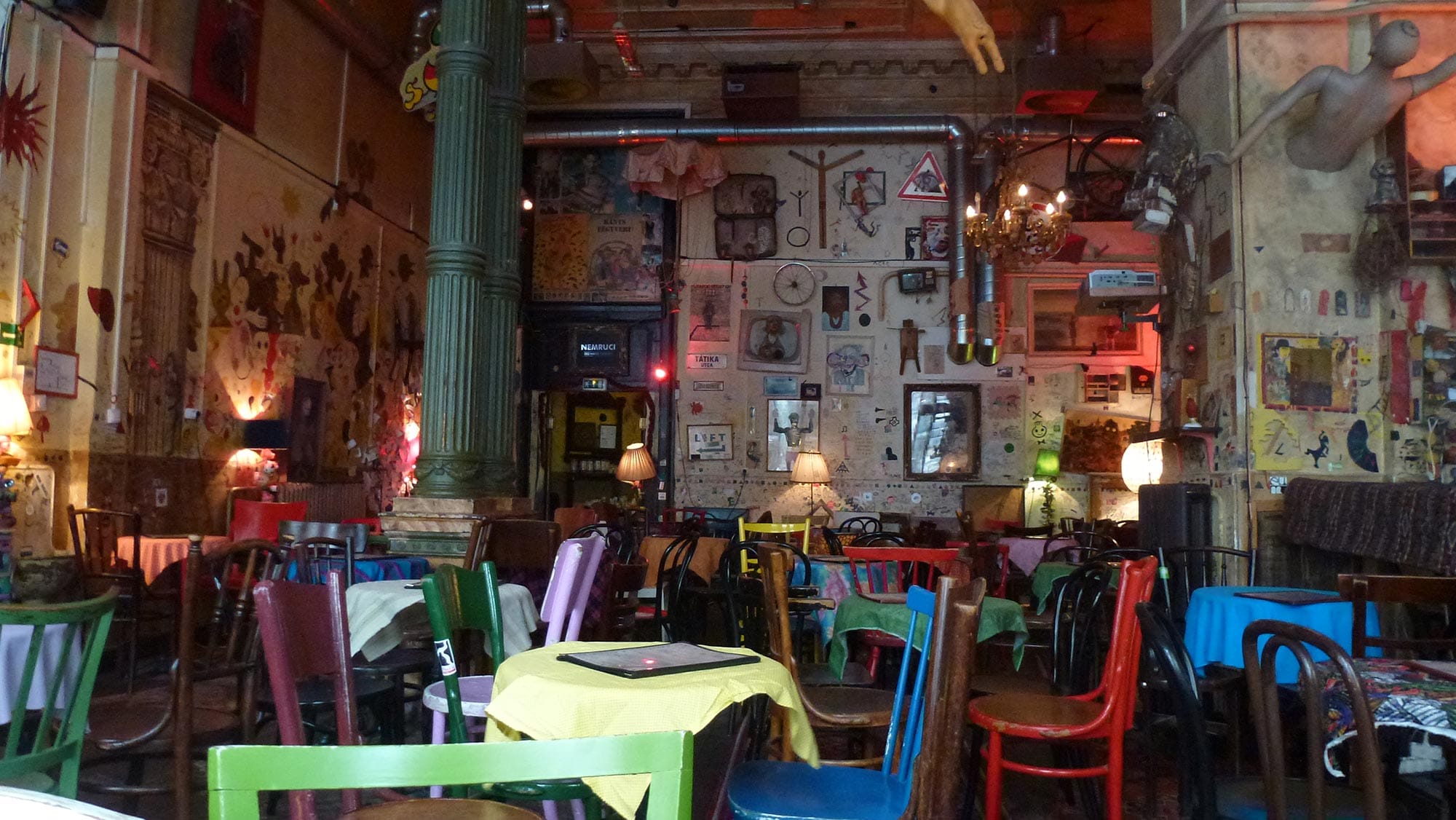 Ma a Budapest – ve l’ho già detto che Budapest è una città meravigliosa? – di bar, ovviamente, ce ne sono di meravigliosi. Alcuni li chiamano ruinpubs, perché, suppongo, molti di essi si trovano in edifici in rovina, tra cui uno dei più famosi, il Szimpla. Su internet ne ho trovati elencati 22, e tra una cosa e l’altra, tra la mattina e la sera, sono riuscita a visitarne una decina. Sono bar, ristoranti, discoteche e gallerie d’arte. Sono deliranti agglomerati di stanze, sgabuzzini, divani, oggetti improbabili, colori, rumori, banconi di bar, sedie e tavoli, lanterne, biciclette, bambole di pezza, quadri, qualsiasi cosa vi venga in mente. La prima impressione stordisce e affascina, nel primo pomeriggio sono vuoti e accoglienti, la notte gremiti di corpi sudati e ubriachi. Si possono passare ore a osservare i muri, i graffiti, a scoprire i dettagli e a notare con stupore che l’apparenza caotica è prodotto della più maniacale attenzione di qualche artista amante dell’accumulo. E infatti ho deciso di passarci diverse ore, e ho scandito la mia giornata vagabondando da uno all’altro, da una via all’altra, da un caffè all’altro.