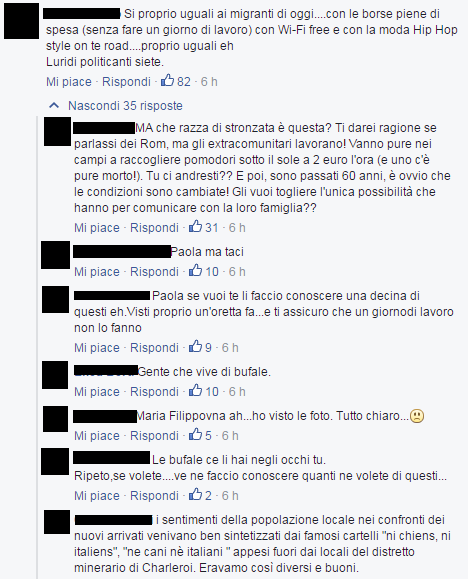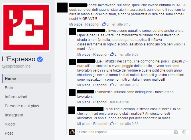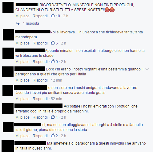 È un fenomeno tutt’altro che ristretto. Commenti simili si possono trovare sotto tutti gli articoli dei principali giornali. In particolare, molte persone sembrano convinte che gli italiani fossero esclusivamente stoici lavoratori, mentre “quelli che arrivano adesso” siano nullafacenti, pigri e “negli alberghi a 4 stelle” — oltre che stupratori, ladri eccetera.