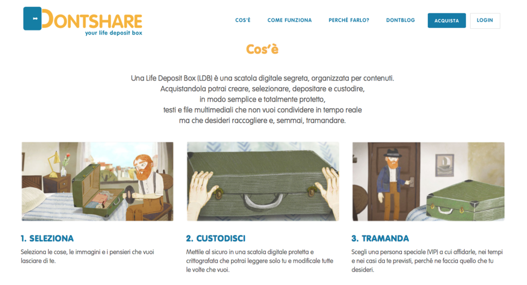 Da quando Dontshare è partito in fase beta, Laura ne ha proposto l’utilizzo a due pazienti e “lo hanno trovato geniale, mi hanno detto che avrebbero voluto incontrarlo prima e lo hanno usato volentieri, perché è di grande conforto per chi muore l’idea di lasciare pietre miliari, oggetti, lettere volontà ― come le direttive anticipate di trattamento ― che possono essere custodite nella cassetta. Per un paziente terminale è un atto estremamente confortante e protettivo.”