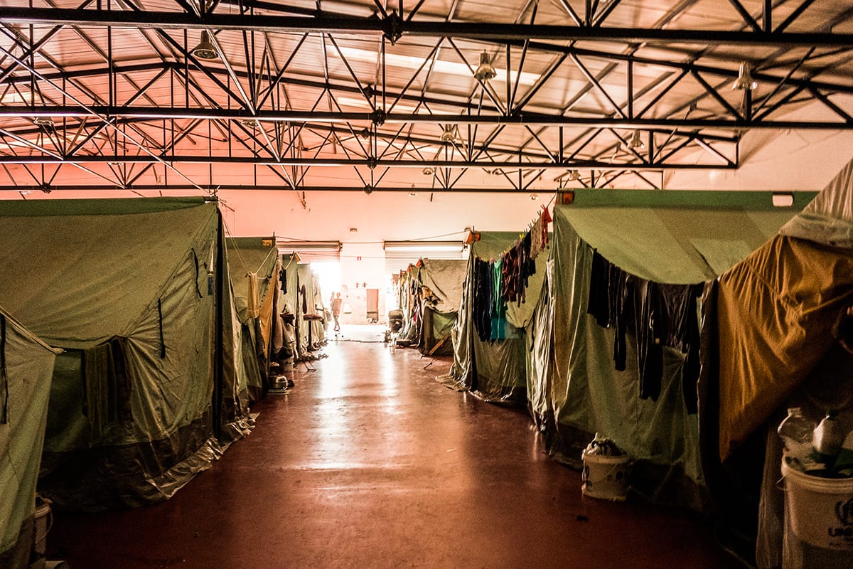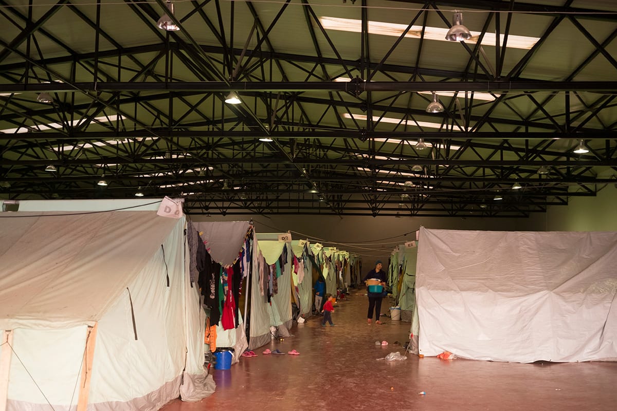 Le tende dell’UNHCR sono divise in settori, dalla A alla F nel primo stanzone. In uno spazio attiguo all’interno della struttura principale c’è un’altra stanza dove si trovano le tende della zona G. All’esterno, invece, l’area H.