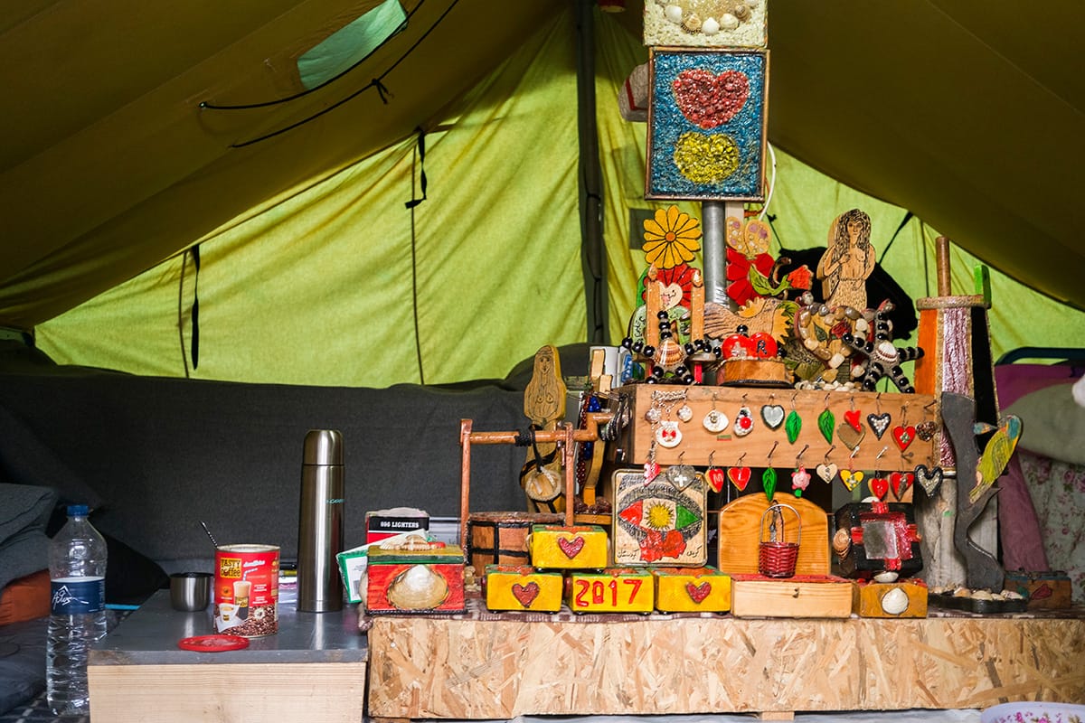 All’interno del campo ci sono anche due tende particolari. Una è un piccolo “market,” come la chiamano gli ospiti di Khalochori. Una famiglia di Kobane gestiva un’attività di alimentari in Siria e ora ha ricostruito un negozio, vendendo cibo, tabacchi e beni agli altri profughi. Infatti, Mohammed ci spiega che i militari donano loro cibo, ma non di tutti i tipi e soprattutto non abbastanza. Non ci sono supermercati e negozi nelle vicinanze, per cui questa famiglia ha deciso di continuare la propria attività. L’altra tenda speciale è un luogo spirituale che Alex definisce il “santuario del campo.” Un signore costruisce con il legno e dipinge degli oggetti di buon auspicio per l’anno nuovo, “siccome questo non è andato molto bene.”