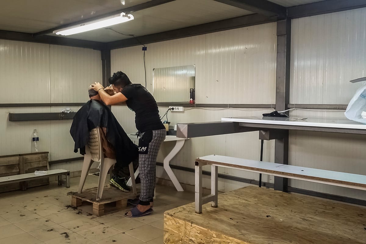 In fondo al container c’è una sedia di fronte a uno specchio. Sabri, un ragazzo siriano curdo di ventun anni, gestisce una sorta di “barber corner,” come lo chiamano nel campo. Lo incontriamo mentre sta tagliando barba e capelli a un signore. È molto concentrato.