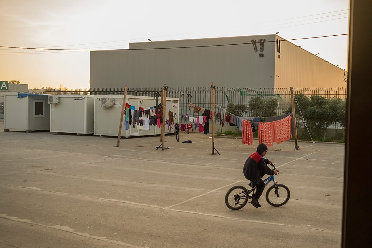 Fra le tende ci sono dei corridoi dove le donne si fermano a chiacchierare e i bambini giocano. Alcuni ragazzini si muovono con in bici all’interno del capannone, altri sono fuori a giocare.
