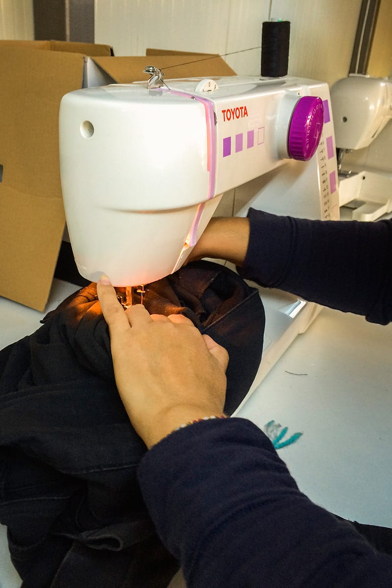 In un altro container si sta svolgendo il corso di cucito organizzato da Alex e Mohammed. Di fronte alle macchine da cucire ci sono una signora e un ragazzo. Lei è una mamma, lui ha solo diciassette anni. Vengono entrambi dalla zona di Aleppo. La mamma, Malak, sta rattoppando i pantaloni della figlia, mentre il ragazzo sta cucendo un paio di pantaloni per una famiglia di Kobane. Alla macchina è velocissimo. Scopriamo che faceva il sarto in Turchia e che ha cucito pantaloni e maglie per tutti i bambini del campo, ricavando la stoffa dalle coperte di pile.