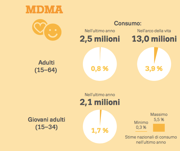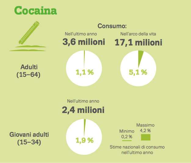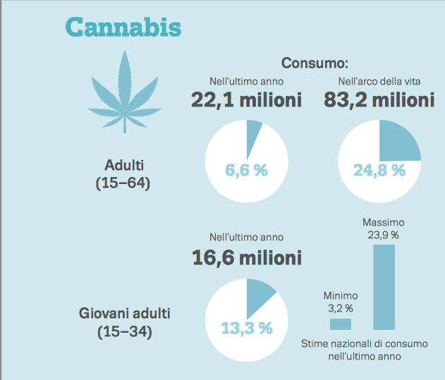 Per quanto riguarda la localizzazione del consumo, quello di cocaina sembra maggiore nei Paesi dell’Europa occidentale e meridionale, mentre le amfetamine sono più diffuse nell’Europa settentrionale e orientale. Ma è la cannabis a rappresentare la quota più ampia del mercato europeo delle sostanze illecite e la sua produzione è diventata una delle principali fonti di reddito per la criminalità organizzata. Inoltre, i reati legati alla cannabis, la maggior parte dei quali riguarda il consumo o il possesso per uso personale, rappresentano circa i tre quarti di tutti i reati connessi alla droga.