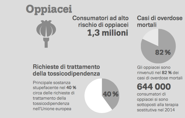 Dal rapporto 2016 dell’Osservatorio Europeo Tossicodipendenze emerge che, oltre alle droghe tradizionali, i consumatori hanno a disposizione nuove sostanze; che i farmaci stanno acquistando maggiore importanza; e infine che i modelli di poliassunzione sono la norma tra coloro che hanno problemi di tossicodipendenza. Gli sforzi di interdizione sono messi a dura prova dal fatto che la produzione di cannabis, droghe sintetiche e persino alcuni oppiacei e nuove sostanze psicoattive ora avviene in Europa, direttamente nel mercato dei consumatori.