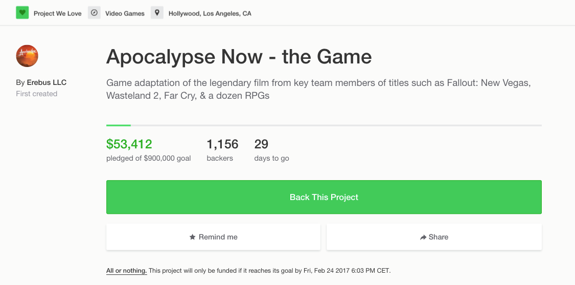 «Quarant’anni fa decisi di fare un film personale che potesse influenzare generazioni di spettatori per gli anni a venire. Oggi sono affiancato da nuovi temerari: una squadra che vuole fare una versione interattiva di Apocalypse Now, dove si potrà impersonare il capitano Benjamin Willard nel duro sfondo della guerra del Vietnam. Ho visto i videogiochi crescere in un mezzo significativo per raccontare storie, e sono entusiasta di esplorare le possibilità di Apocalypse Now per una nuova piattaforma e una nuova generazione» afferma Coppola nel video di presentazione della campagna fondi per il progetto — il cui obiettivo è stato posto a 900,000 dollari per la fine di febbraio.