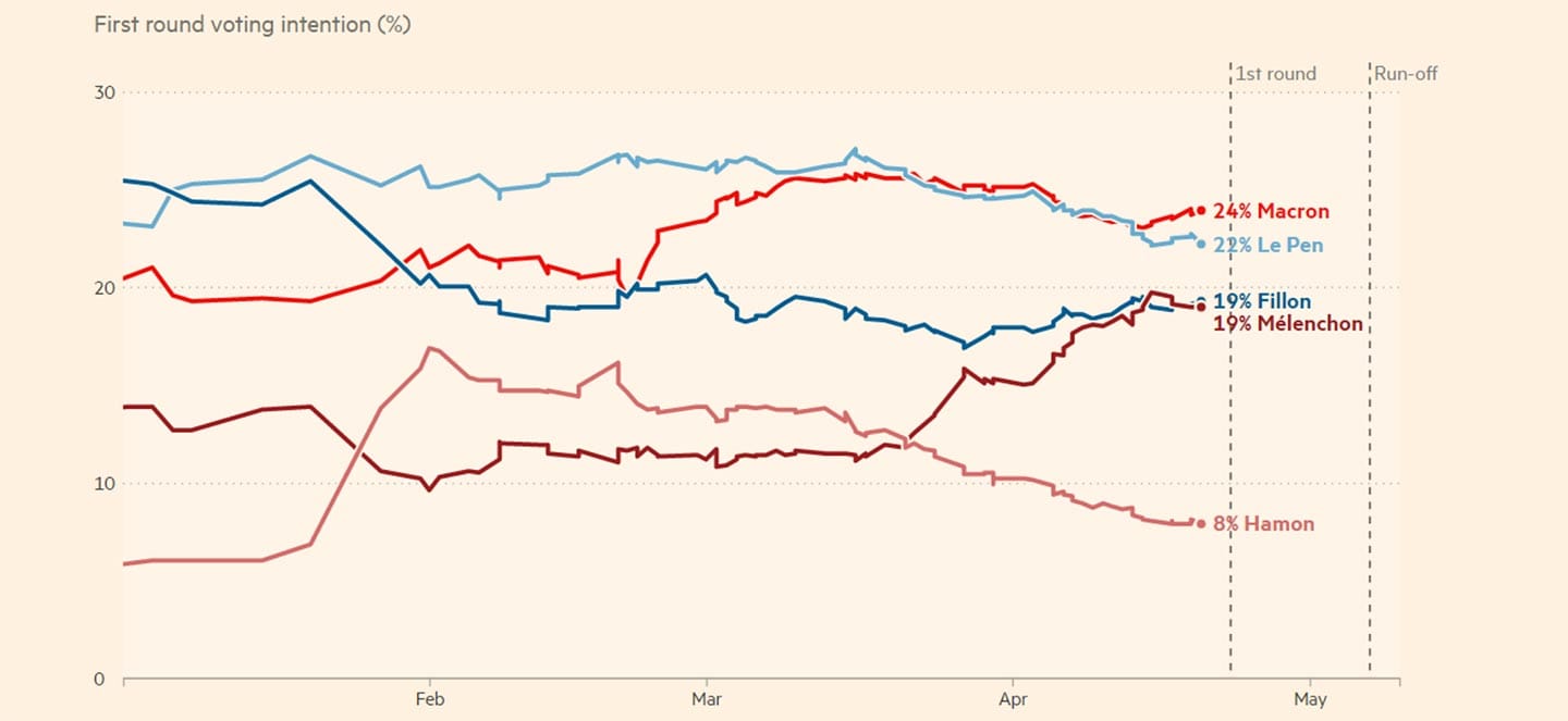 In un paese che è sempre stato caratterizzato per un bi-partitismo granitico e un’alternanza al potere quasi algoritmica, l’attuale situazione è tanto nuova quanto straordinaria. In (quasi) tutte le scorse elezioni presidenziali francesi non solo era abbastanza scontato prevedere chi arrivasse al ballottaggio, ma era anche relativamente facile individuare il candidato favorito. Ora è tutto cambiato. Ed è altrettanto straordinario che per la prima volta possano salire sul podio soltanto candidati non appartenenti ai cosiddetti partiti dell’establishment (Macron, Le Pen e Mélenchon).