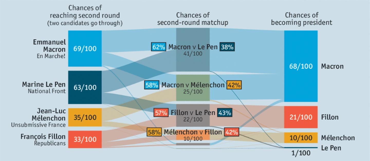 Tantissimi sono i fattori potranno influenzare un risultato quanto mai incerto. Primo fra tutti l’astensione. Se buona parte dei francesi delusi dalla politica non dovesse fare lo sforzo di andare a votare lo scenario cambierebbe e, secondo alcuni, potrebbe favorire i candidati estremi. Importante sarà anche il peso del cosiddetto “voto utile”, ossia la scelta di un candidato non idealmente perfetto ma con più possibilità di vittoria. Data la profonda incertezza del primo turno, sondaggisti e opinionisti politici si sono divertiti nell’esaminare i vari scenari che potrebbero palesarsi al ballottaggio, a seconda di quali siano gli sfidanti. Lo studio migliore e più esaustivo l’ha fatto l’Economist che, attraverso un’analisi statistica, presenta le chance di vittoria di ciascun candidato e i vari potenziali risultati del secondo turno.