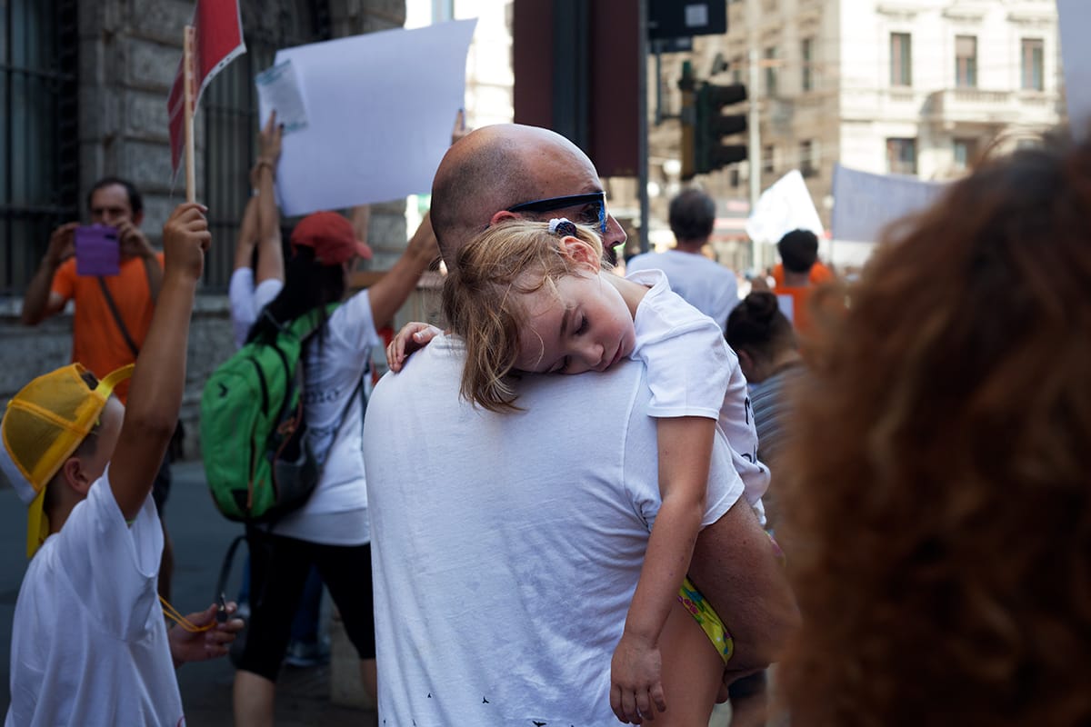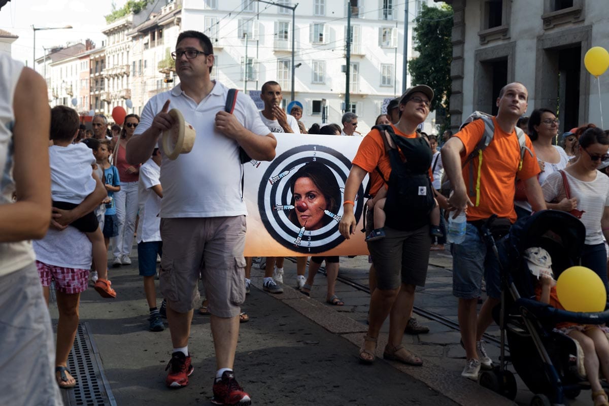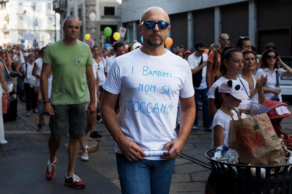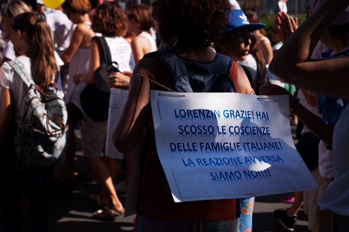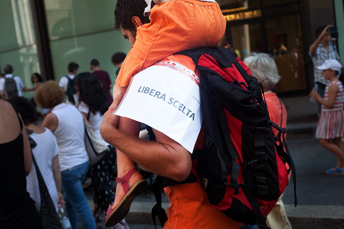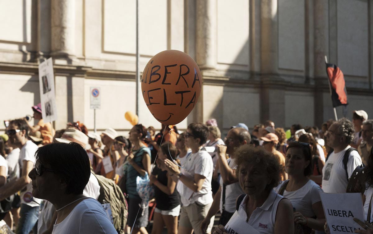 Tante famiglie giovani, tanti bambini, tutti vestiti di bianco e ognuno con in mano un palloncino colorato. Il caldo pomeriggio di luglio non ha fermato chi chiede chiarezza al governo su una legge nata per un’emergenza che tanti genitori non condividono.