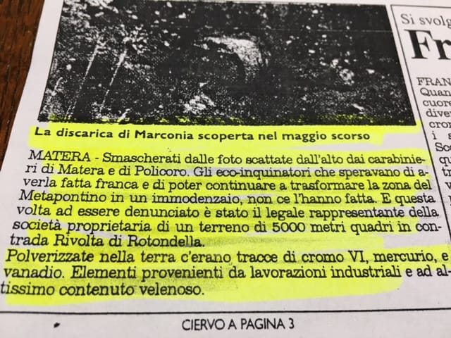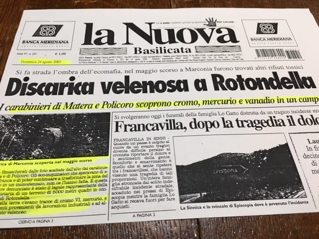 Uno dei nostri informatori ci mostra la testata de “La Nuova Basilicata” del 24 agosto 2003, dove si legge che uno dei tanti punti di deposito abusivo si trovava proprio nel territorio di Rotondella, qualche chilometro a sud dell’impianto Itrec, vicino al litorale.
