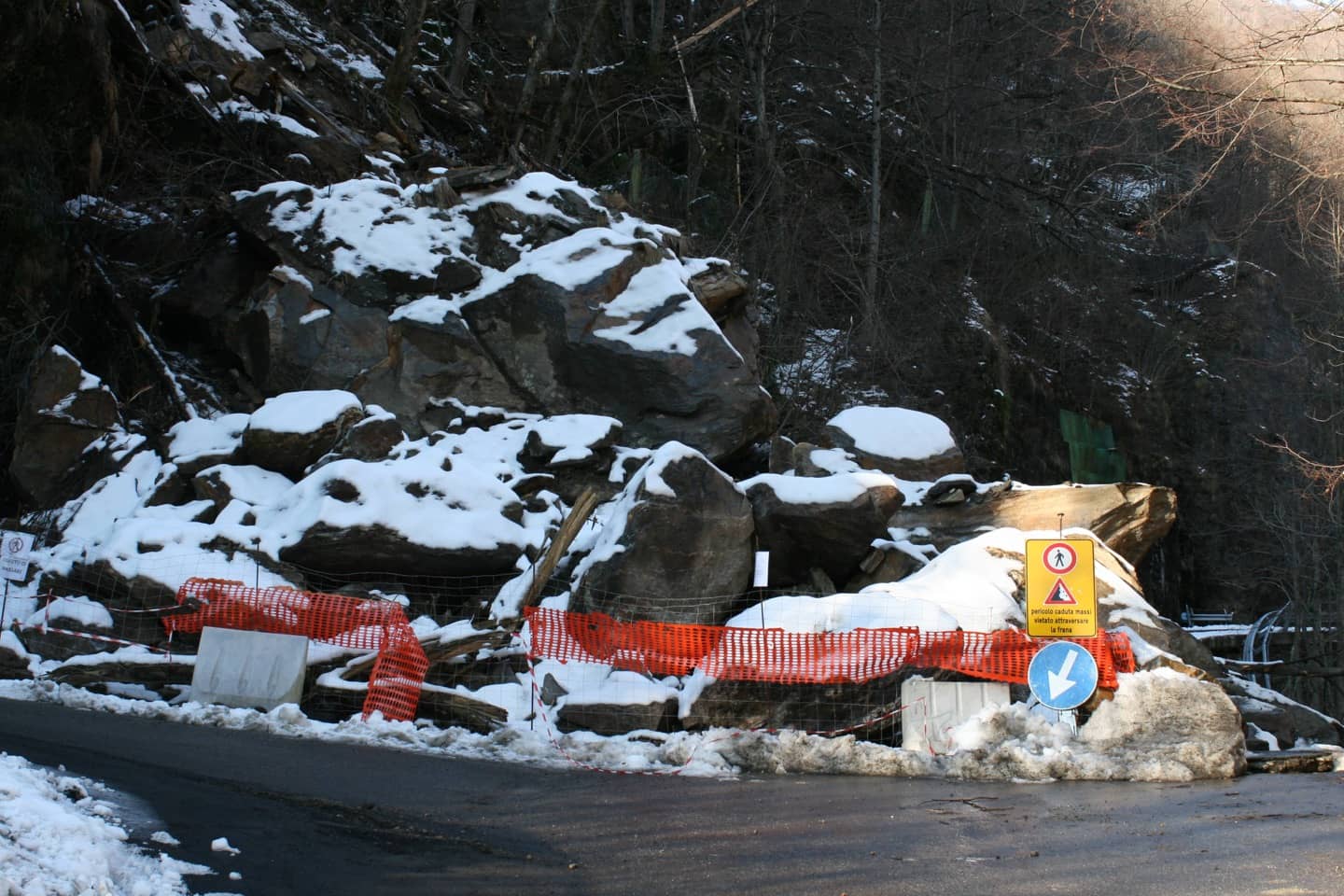 Massi e detriti occupano le corsie impedendo il transito ai veicoli in entrambi i sensi di marcia.