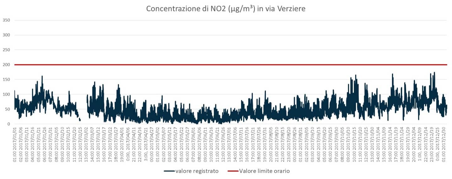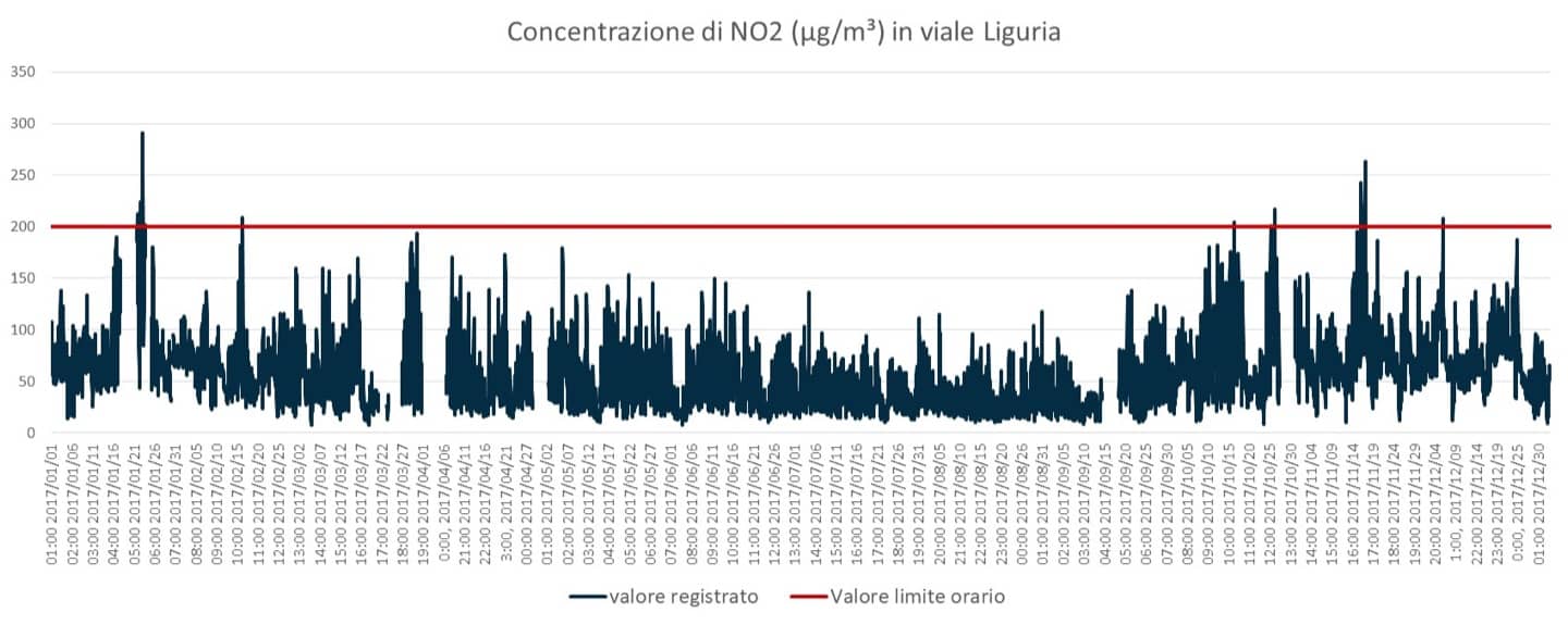 Per quanto riguarda la concentrazione media oraria, quasi tutte le stazioni hanno rispettato la soglia di legge (200 µg/m³); fa eccezione quella in viale Liguria, che l’ha sorpassata per 19 volte, mentre quella in viale Marche è arrivata a 11.
