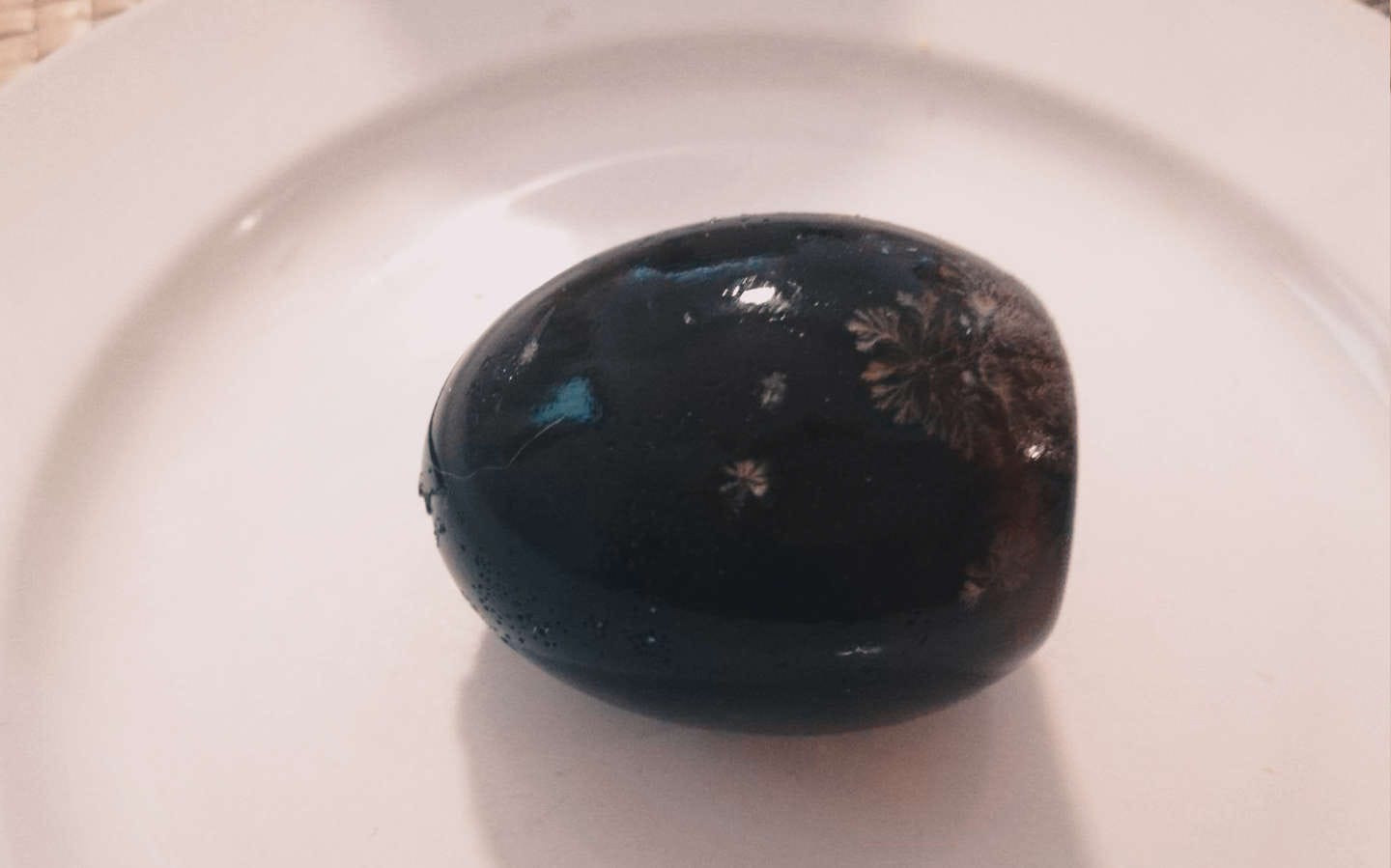 Ho aperto il primo uovo e l’interno è esattamente come tutte le foto che avevo visto: questo colore marrone semitrasparente e queste macchie biancastre che si espandono come radici lungo la superficie dell’albume mi ricordano un motivo ornamentale che sembra quasi artificiale. Il tuorlo è meno invitante, con un colore nerastro e dei cerchi concentrici che si espandono dal centro.