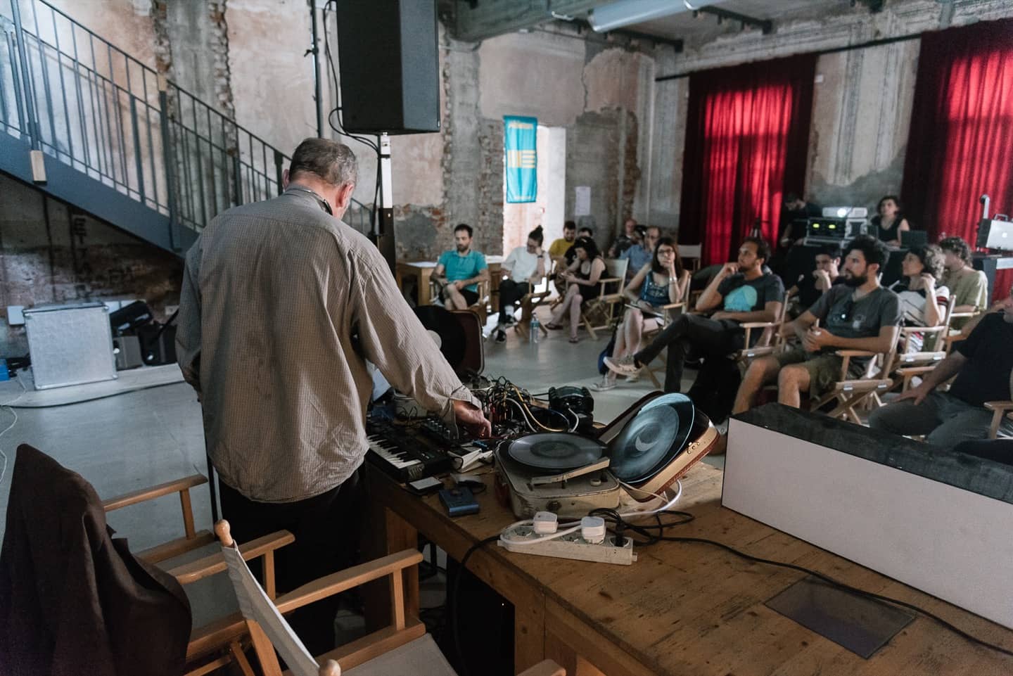 Al centro del secondo appuntamento della rassegna ExEx, Production – all’interno del programma del ciclo di laboratori di innovazione musicale organizzati da Electropark Exchanges al Teatro Franco Parenti, novità proposta con l’edizione 2018 e curata da Sabina Barcucci – c’era Philip Jeck (ai giradischi), che ha inaugurato “Improvising in Sound and Image”, la studio session condotta insieme ai colleghi Karl Lamieux (al proiettore 16mm) e Michaela Grill (al laptop).