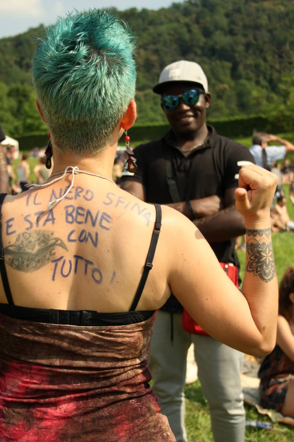 Sono qui perché questa è l’unica festa in cui si può prendere il sole durante la giornata e in cui si possono incontrare delle persone che hanno le mie stesse idee. Il concetto che sta dietro lo sostengo assolutamente, in questo momento e con questo tipo di governo mi sembra che sia importante che ci siano dei festival che manifestino queste idee.