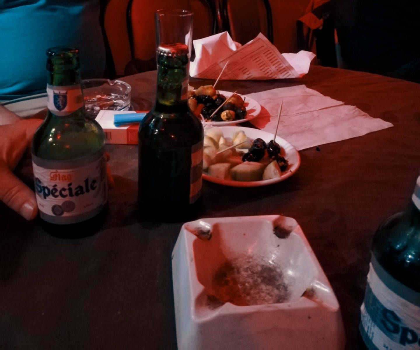 Donne sole sedute ai tavoli che fumano davanti a piatti di olive e cetrioli. Ovviamente si tratta di prostituzione da duecento Dirham, venti euro. Quaranta contrattabili per me che ho una felpa gialla e la macchina fotografica al collo e anche se sembro marocchino non parlo arabo né francese.