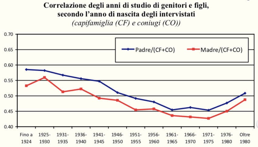 “Sicuramente fino agli anni Settanta è confermata dalla letteratura la diminuzione dell’indice di relazione tra istruzione dei genitori e quella dei figli. Poi ricomincia a crescere.” Secondo la professoressa Parravicini, le cause di questa crescita, specie negli ultimi dieci anni, sono di natura economica. “La golden age spiega la tendenza precedente: era meno importante avere genitori istruiti. Soprattutto dal 2010 in avanti le cose cambiano per effetto della crisi, che abbiamo visto anche in università con un calo di iscrizioni. Diventa di nuovo importante avere una famiglia istruita ma anche con alto reddito: non parlo in senso stretto di ricchezza — famiglie che sono riuscite a garantirsi un reddito medio-alto hanno garantito più anni di studio ai figli.”