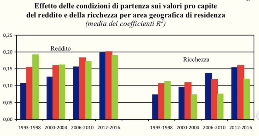 Gli autori, comunque, fanno notare che “negli anni Novanta gli effetti delle condizioni di partenza sul reddito e sulla ricchezza erano decisamente più rilevanti nel Sud che nelle altre aree del paese. Nel corso degli anni questa differenza si è attenuata fino a scomparire nel caso del reddito e addirittura invertire il segno nel caso della ricchezza. Nel Sud rimane comunque relativamente più rilevante il fattore istruzione dei genitori mentre nel Centro e nel Nord sono più importanti i fattori legati al luogo di nascita (per gli stranieri in particolare, che spiegano una parte significativa dell’aumento della rilevanza delle condizioni di partenza intervenuto nel Centro Nord nel corso del tempo).”