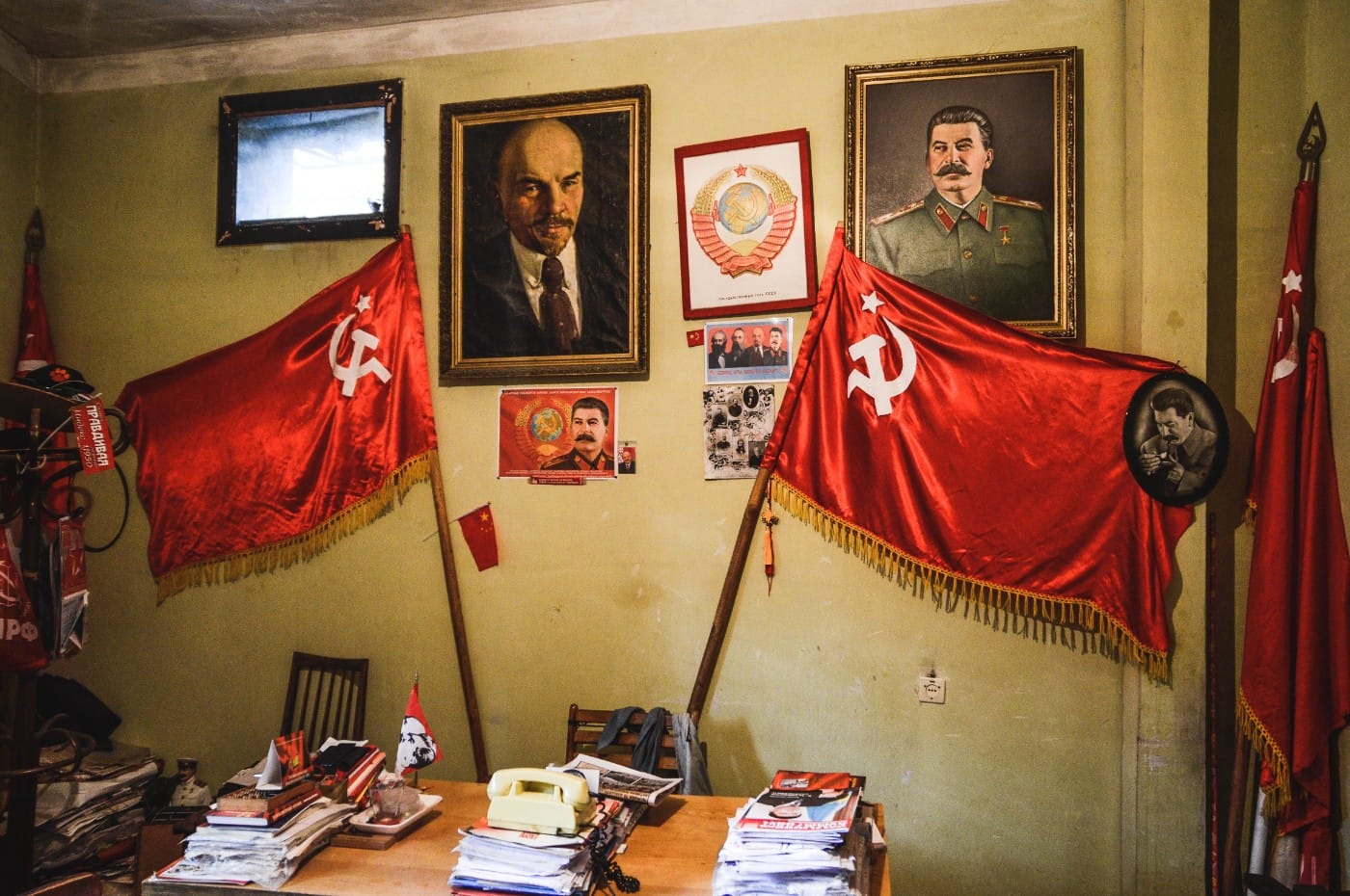 “Vieni, ti faccio vedere l’ufficio” mi chiama Pipia notando la mia curiosità. Due grandi bandiere rosse occupano la parete, eclissate solo dai ritratti incorniciati di Lenin e Stalin. Un vecchio telefono rotativo occupa il centro della scrivania in legno, circondato da documenti e pile di giornali disordinate. “Qui è dove tentiamo di far sì che il futuro non vada in rovina,” mi dice ridendo “ma quando la politica ci delude, per fortuna c’è ancora il cibo, l’unica cosa su cui i georgiani sembrano ancora essere uniti. Hai già provato l’ajapsandali?”