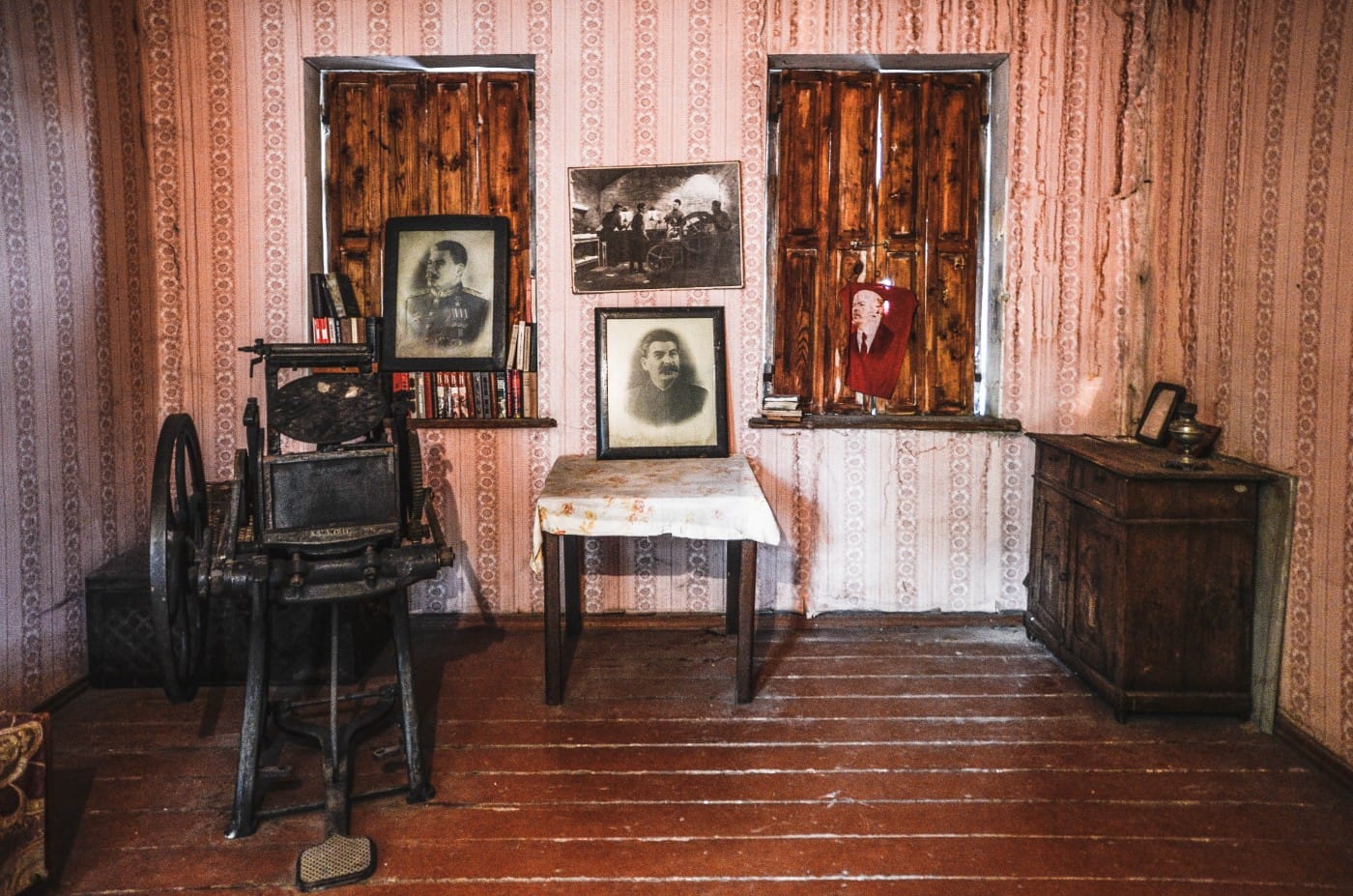 “Qui è dove Iosif riposava alla fine del suo turno” mi viene spiegato mentre visitiamo una della camere della casa. In un angolo di questo spazio disadorno, un letto singolo protetto da un cordone rosso è circondato da carta da parati sbiadita e pile di libri erette davanti alle finestre; vecchi giornali accatastati su scaffali e arredo raccontano la salita al potere di Stalin, mentre poster e ritagli appesi al muro decorano la sala facendola somigliare più ad uno santuario religioso che ad un museo. “Sappiamo che ha sbagliato” mi spiega la rappresentante del partito, “Sono stati commessi molti errori, è innegabile. Politicamente però, Stalin è stato un genio. Quel che è successo tra queste mura ha fatto la Storia.”