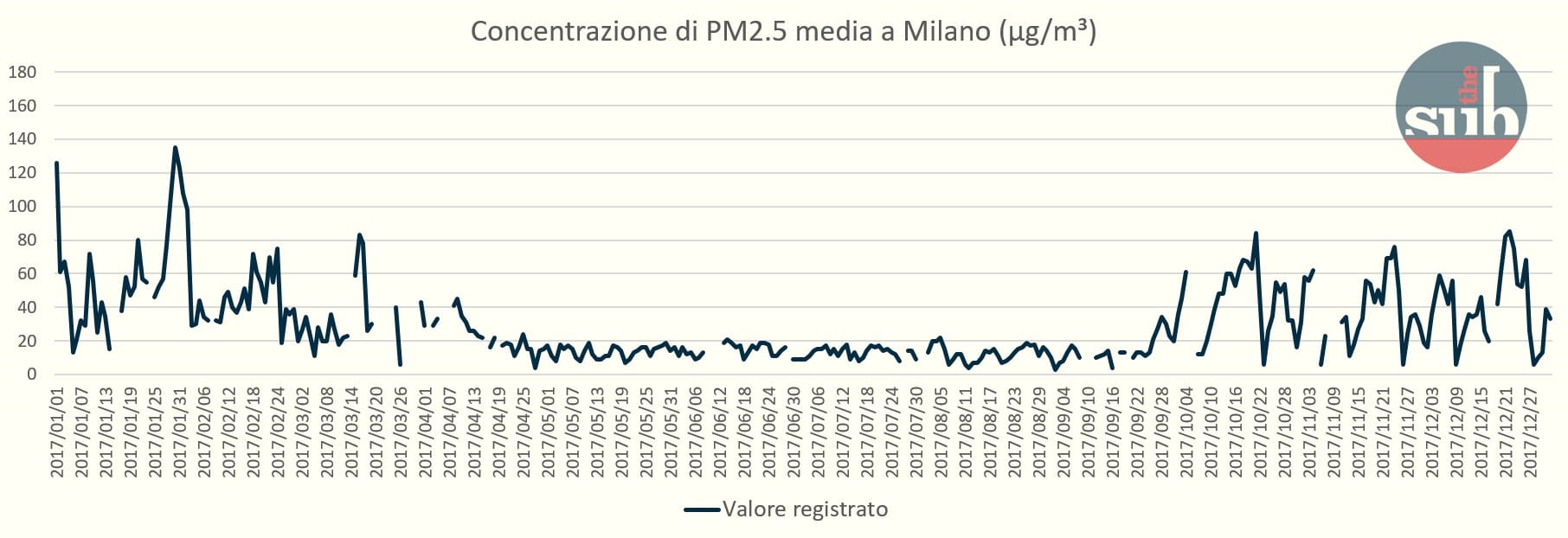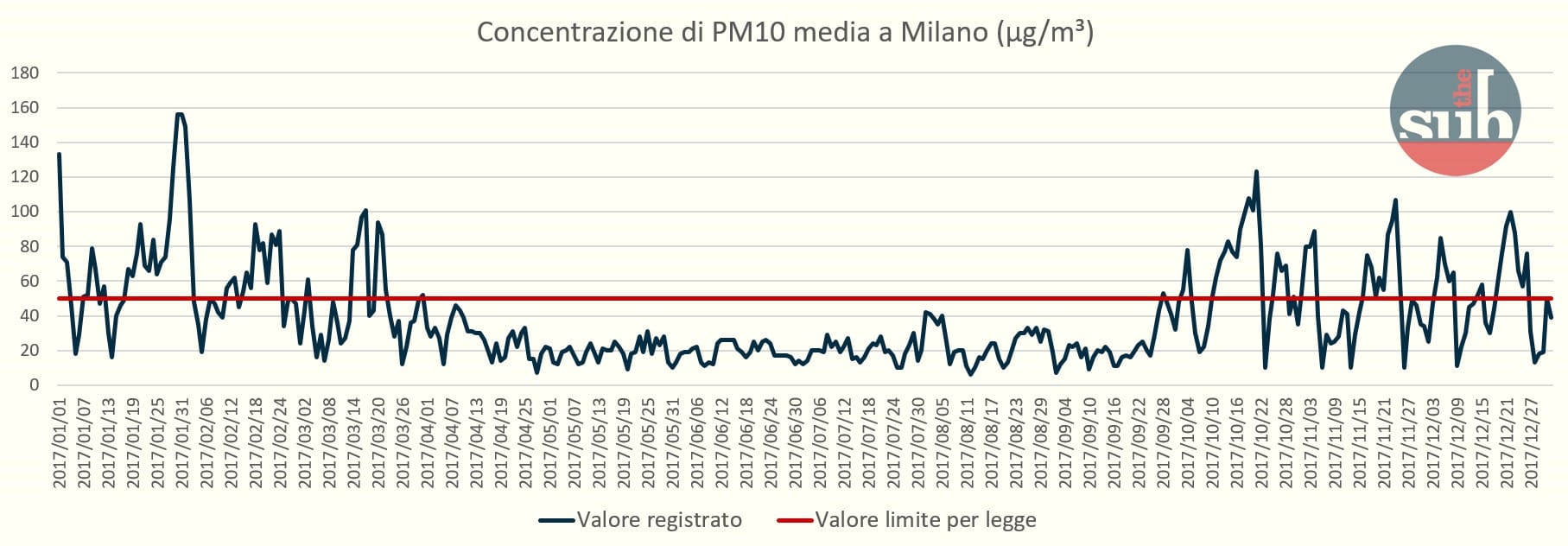 Nel 2017 ad esempio, il particulate matter medio giornaliero (PM 10) è risultato fuori legge per ben 95 giorni, contro un massimo di 35 giorni consentito dalla legge (più del doppio!), mentre il PM 2.5 – il più micidiale per il corpo umano – ha registrato diversi picchi di oltre 80 µg/m³ e una media annuale di 29.29 µg/m³, contro una soglia normativa di 25 µg/m³.