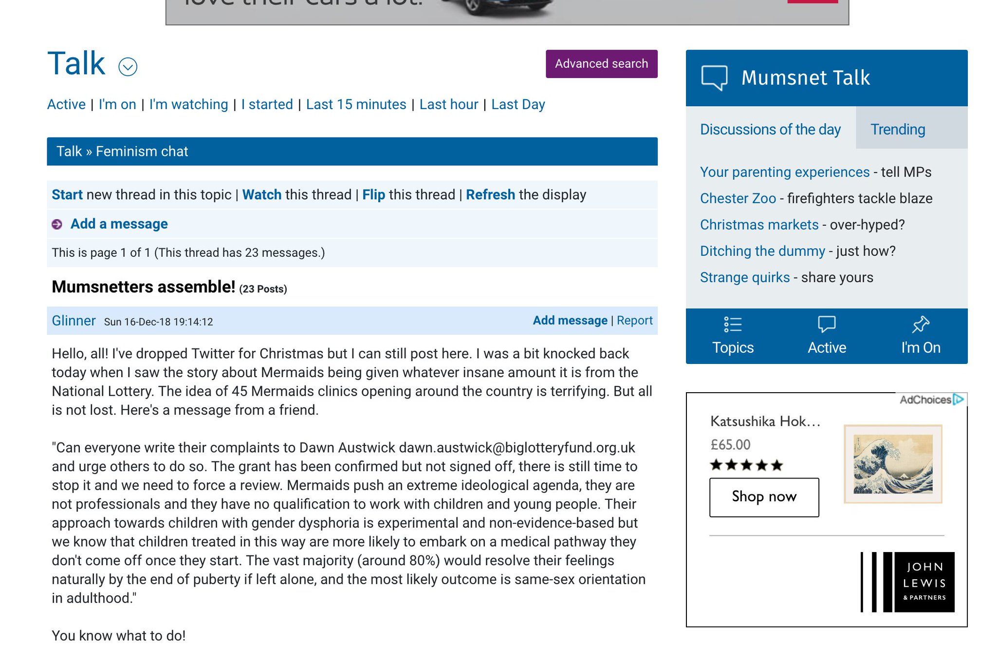 Mermaid era stata selezionata lo scorso dicembre per un donazione di 500 mila sterline da parte del Fondo della Lotteria Naziononale del Regno Unito, ma in seguito a numerose proteste, istigate dallo sceneggiatore Graham Linehan e riprese dai media conservatori, la donazione era stata riesaminata e congelata; la campagna contro Mermaid sosteneva che si trattasse di un “gruppo aggressivo”, intento a incoraggiare procedure di cambio di sesso nei bambini, dimostrando al contempo la cedibilità della stampa nel riportare accuse prive di fondamento contro un’istituzione impegnata nella difesa di persone estremamente vulnerabili; secondo uno studio recente infatti, in Gran Bretagna quasi la metà degli studenti transessuali in età adolescenziale ha tentato il suicidio.