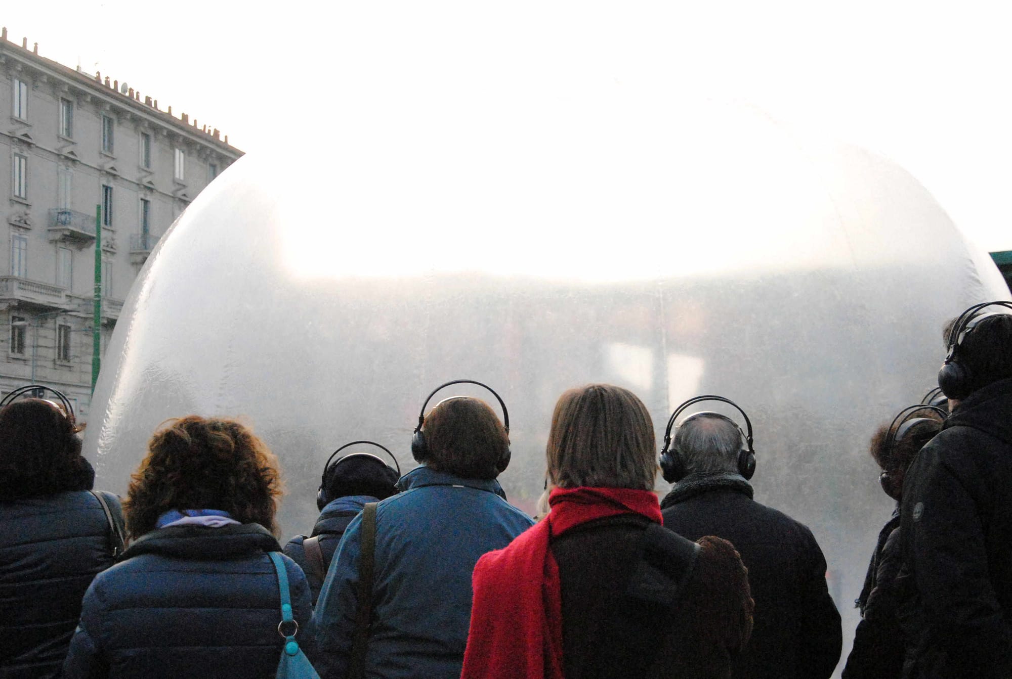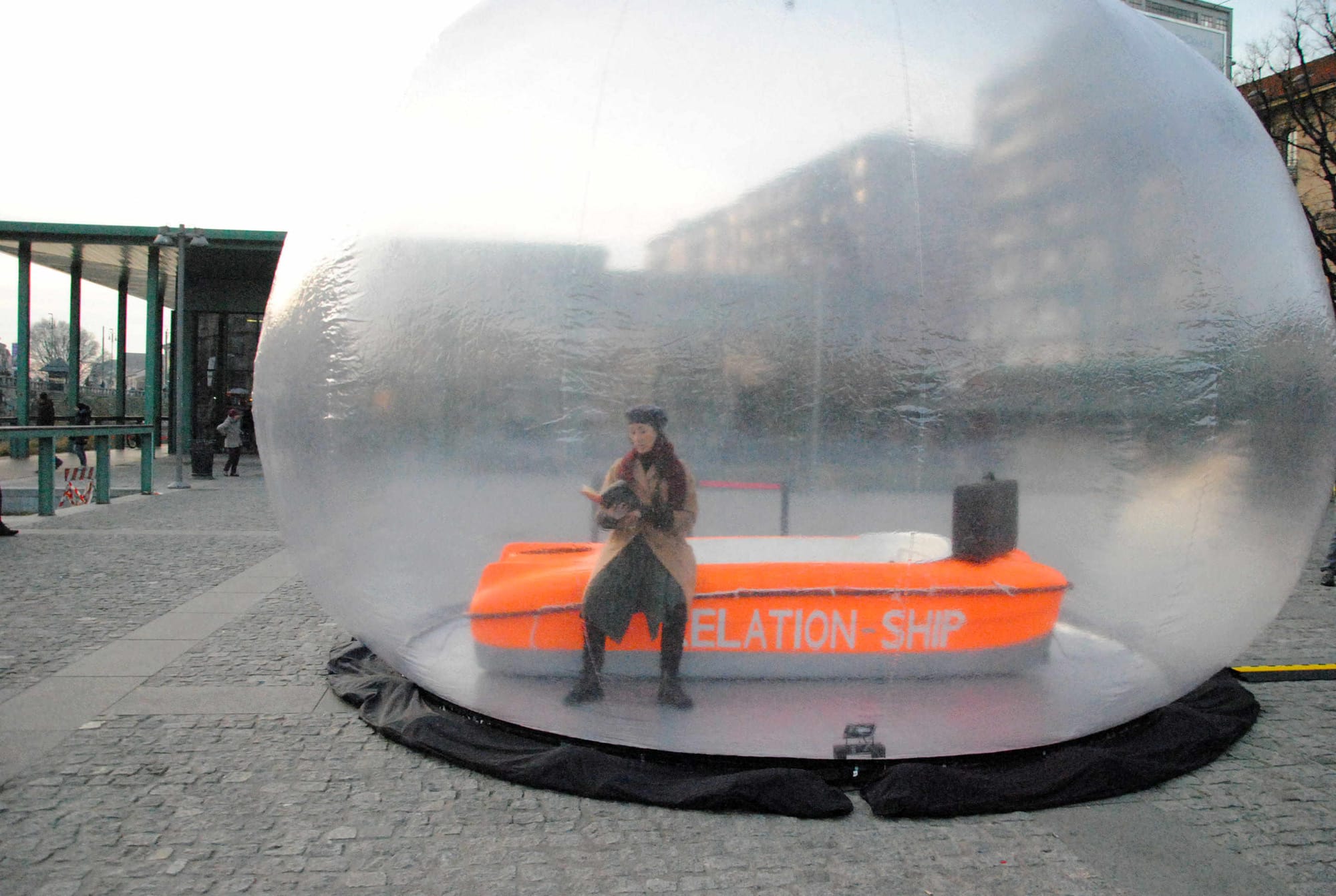 L’installazione, curata da Giovanni Jussi della compagnia “Twof2 + Das Collectiv,” ha attirato l’attenzione e l’interesse dei passanti. Dentro la bolla, oltre al performer — unito agli spettatori solo attraverso il collegamento silenzioso delle cuffie — c’era la barca arancione di Relation-Ship, “scialuppa di salvataggio per le relazioni umane” ideata dall’artista Chiara Colombi. Difficile non pensare alle tragedie che continuano a susseguirsi nel Mediterraneo: un modo per ricordare ancora una volta che la memoria non appartiene soltanto al passato, ma anche e soprattutto al presente.