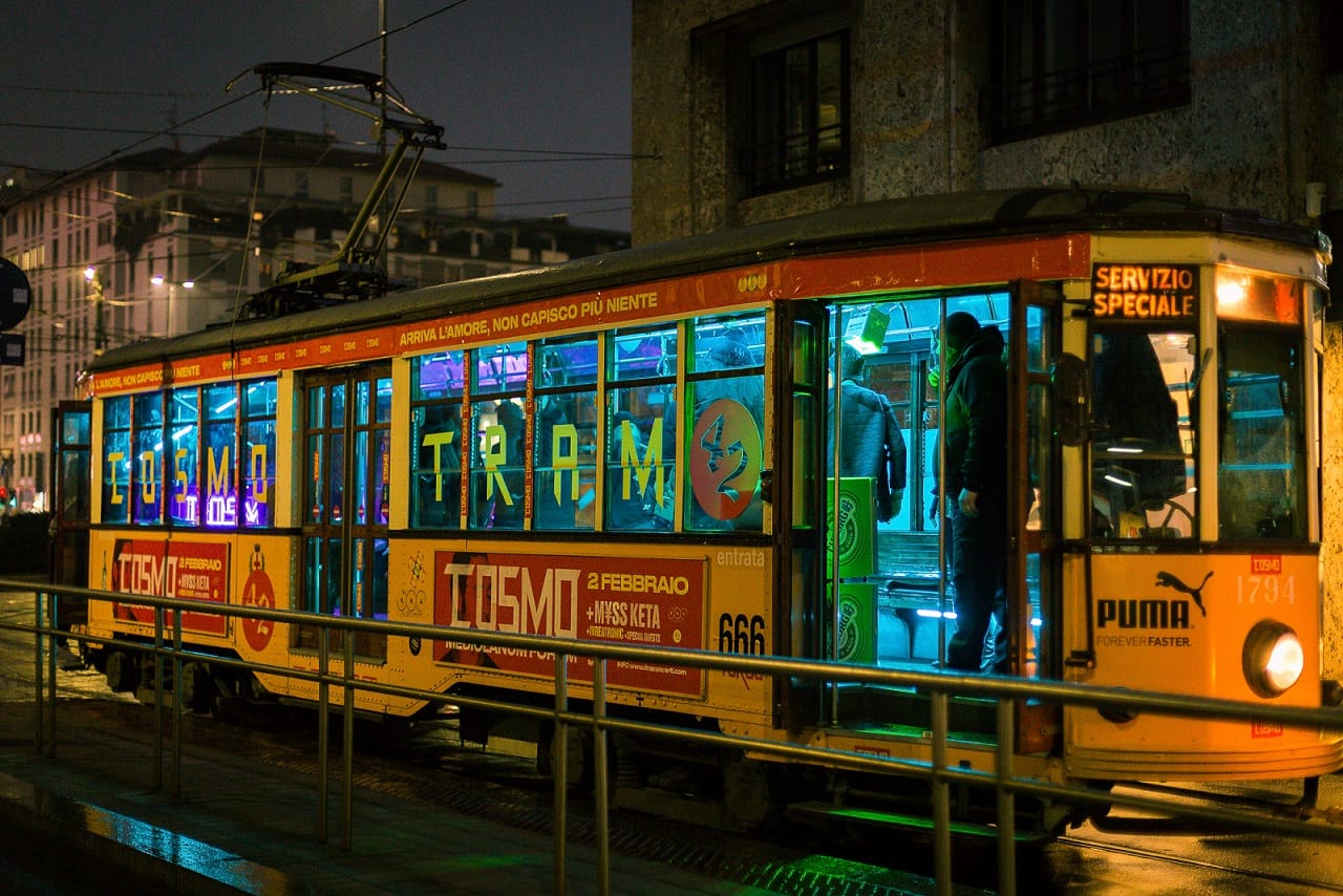 Ieri Cosmo ha suonato per 5 ore su un tram che ha viaggiato per le vie del centro di Milano. Durante il tragitto Cosmo e Ivreatronic – il collettivo di dj e producer originari di Ivrea – si sono esibiti in un djset a cui si sono aggiunti, lungo il viaggio, Myss Keta e molti passeggeri saliti ad ogni fermata.
