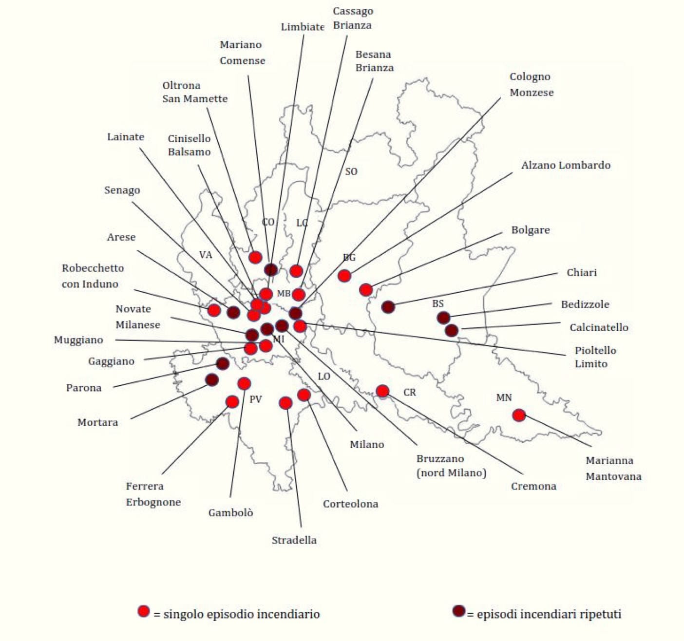 Dal cemento all’analisi dei reati ambientali e, in particolare, dello smaltimento illecito di rifiuti che vede protagonista principale la Lombardia occidentale. La ’ndrangheta pare essere il principale soggetto attivo in questo settore d’investimento al nord. Dinamiche che “vedono coinvolte imprese legate ai clan attive nel movimento terra, settore tradizionale dell’economia legale mafiosa” che rispetto allo smaltimento dei rifiuti svolge una funzione propulsiva» scrive Cabras nel documento. La regione come nuova “terra dei fuochi”, le discariche date alle fiamme, anche più volte, come riportano le interessanti tabelle presenti nel report, inquietanti fenomeni dietro ai quali con ogni probabilità si staglia la presenza dei clan.