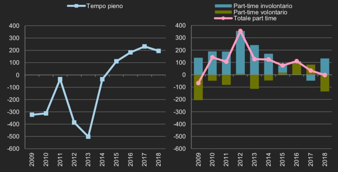 Occupati per regime orario. Anni 2009-2018 (variazioni assolute in migliaia)