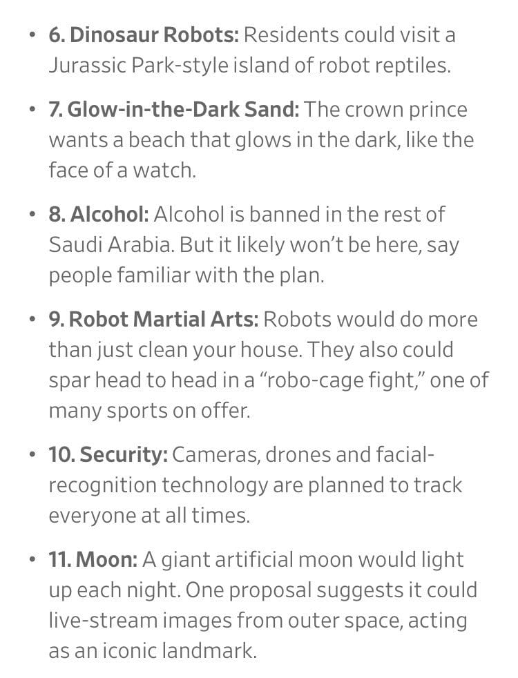 Quando non ordina l’omicidio brutale di giornalisti avversi al regime, il principe saudita bin Salman continua a sognare la propria città del futuro, con pioggia artificiale, dinosauri robot, e taxi volanti. Il Wall Street Journal ha ottenuto un documento di 2300 pagine in cui evidentemente i consulenti del principe si divertono a sue spese. (Gizmodo, link dietro paywall al Wall Street Journal)