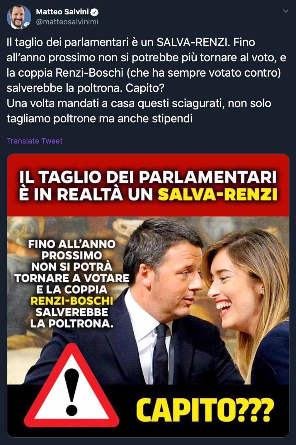 Letteralmente 24 ore prima Salvini aveva twittato che il taglio dei parlamentari era un “Salva Renzi.” Perché “fino all’anno prossimo non si potrebbe più tornare al voto.” Il tweet è ancora online — tanto la coerenza non vale assolutamente niente.