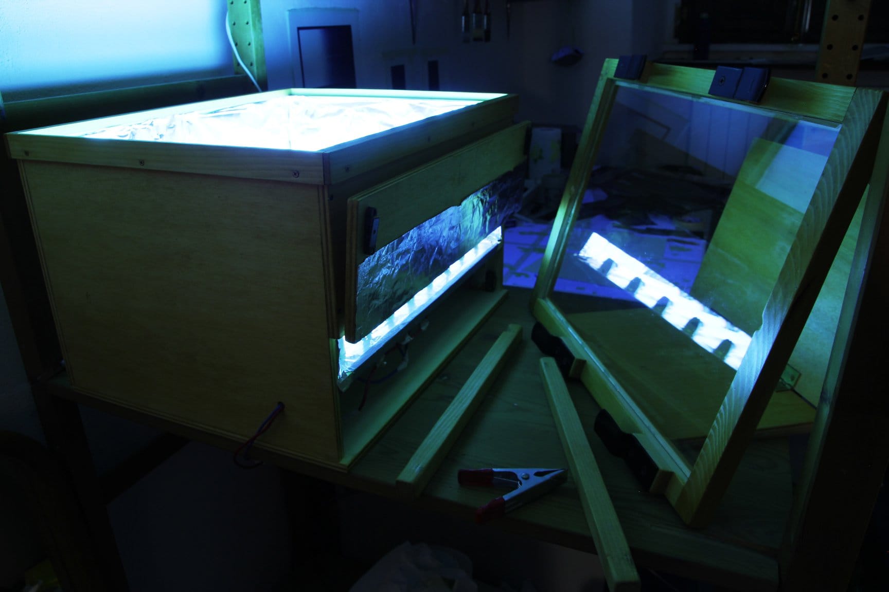 È una delle primissime tecniche di stampa, si realizza miscelando due soluzioni in acqua distillata di diversi sali di ferro. La miscela, diluita, si versa su una carta abbastanza spessa, di cotone, da acquerello. Si tratta di un tipo di stampa a contatto, per cui poi si deve premere con un torchio il negativo dell’illustrazione o della fotografia — o anche piante secche! — che si vogliono imprimere sulla carta. Quindi, una volta che il negativo è aderente al foglio, lo si espone alla luce del sole o a delle luci UV. Se si usa la luce naturale i tempi possono variare molto, anche più di venti minuti in inverno, mentre d’estate basta un minuto o due. Noi ora usiamo un bromografo — una scatola con delle luci UV — che abbiamo costruito noi stessi. Una volta che la carta è stata esposta, si lava via l’emulsione gialla, si fanno due o tre lavaggi, e la parte che è stata colpita dalla luce diventa blu! Chi viene al workshop scoprirà che facciamo l’ultimo lavaggio con una sostanza “segreta,” che velocizza l’apparire dell’immagine — ed è forse il momento più bello di tutto il processo, perché vedi proprio il blu di Prussia che esce dall’immagine.