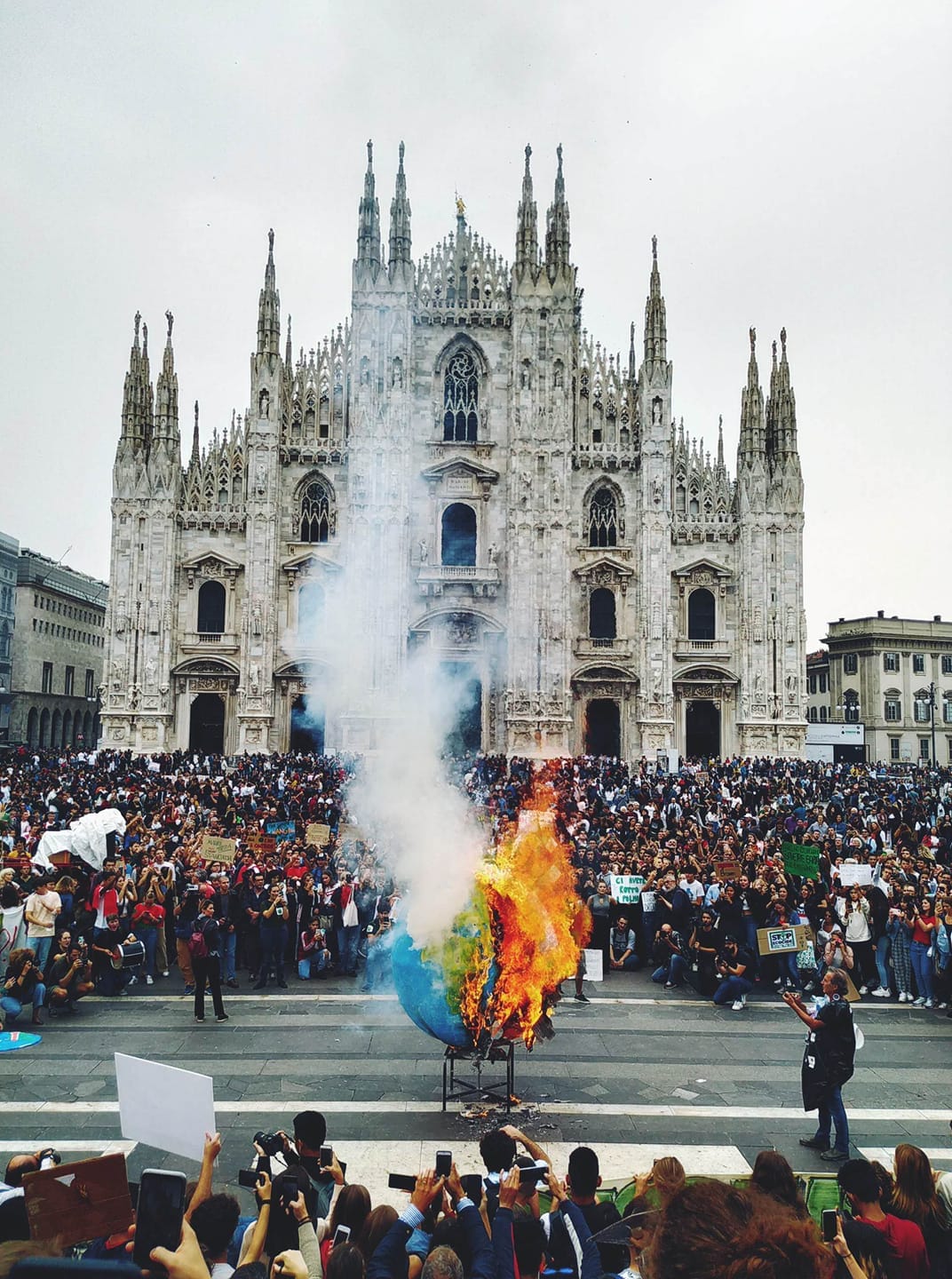 A Milano il corteo del mattino contava tra i 150 mila e i 200 mila partecipanti. Alla fine della manifestazione, in piazza del Duomo, è stato dato alle fiamme un modellino del globo terrestre. (il Giorno)