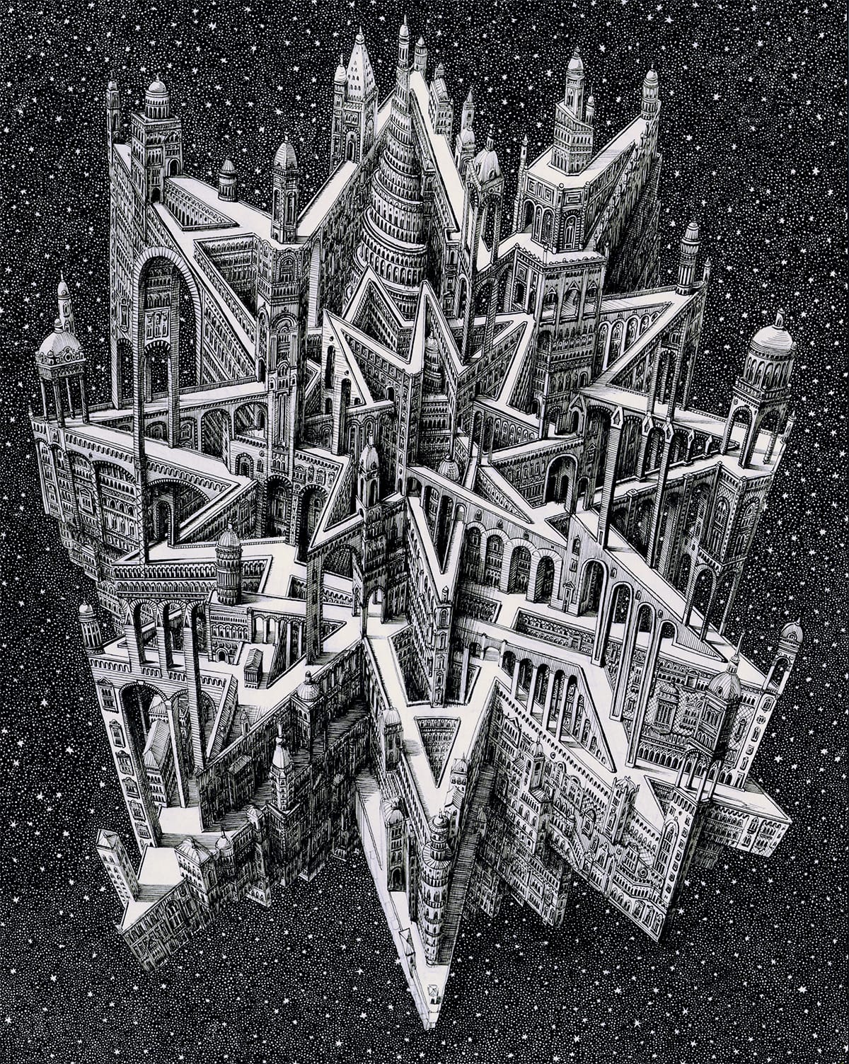 Benjamin Sack è un artista che fa base in Virginia e che disegna città impossibili, labirintiche, costruite su effetti ottici geometrici. Sack sostiene che la sua arte sia costantemente in lotta con “la paura per gli spazi vuoti.” Ma non c’è niente di cui avere paura. (Colossal)